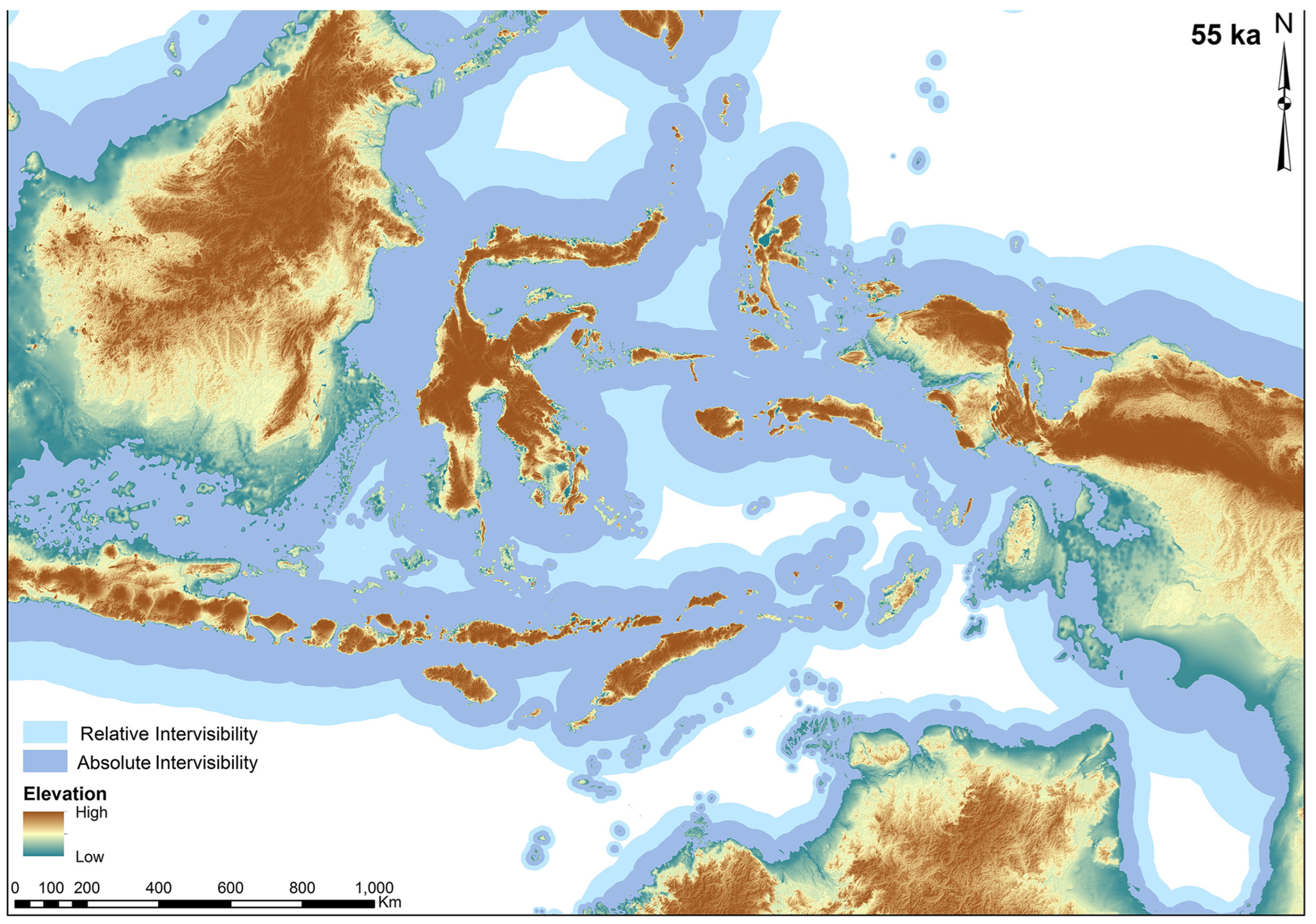 - Kealy, S.; Lous, J.; O’Connor, S. Reconstructing Palaeography and Inter-island Visibility in the Wallacean Archipelago During the Likely Period of Sahul Colonization, 65–45,000 Years Ago. Archaeol. Prospect. 2017, 24, 259–272. [Google Scholar] [CrossRef]