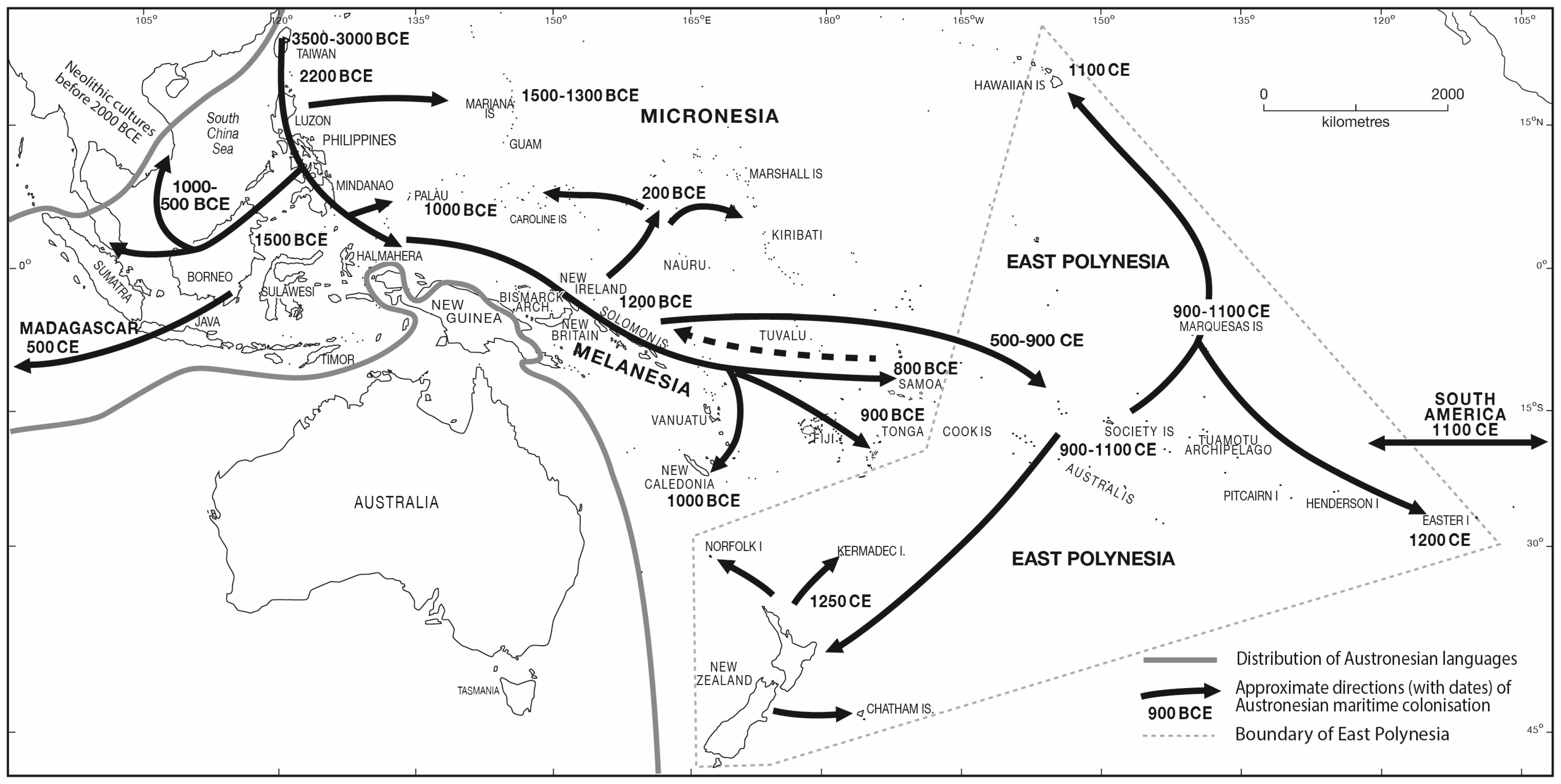 The linguistic findings match the archaeological record with regard to dispersal speed. The archaeology… indicates that Neolithic cultural complexes dispersed at some speed, between c.2000 and 1350 BC, from the northern Philippines southwards into the Indo-Malaysian archipelago, and eastwards beyond New Guinea into the Bismarck Archipelago.[3] (p. 346)
