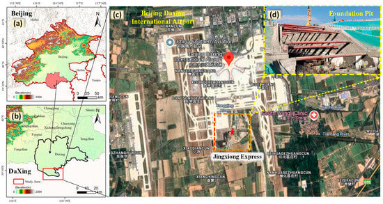 In summary, foundation pit engineering is inherently high-risk, region-specific, and operates with limited safety margins [29,30,31,32]. Therefore, mitigating the effects of extreme weather on foundation pit projects is a pressing challenge in the engineering field. However, there remains a lack of field-validated numerical analyses integrating multi-sensor monitoring data with hydro-mechanical coupling under real extreme rainfall events. Moreover, in the context of intensifying global climate change, monitoring excavations during rare extreme weather events is becoming increasingly crucial. To address this issue, this study investigates a foundation pit project in Beijing’s Daxing District (Figure 1), following the “31.7” catastrophic rainstorm. Using field monitoring data collected before and after the rainstorm, a three-dimensional numerical model incorporating hydro-mechanical coupling effects was developed. The model was employed to investigate the effects of rainfall on soil displacement and support structure deformation, with a critical groundwater level proposed as a hazard threshold. The findings of this research provide both technical guidance and theoretical support for the construction and safe support of deep foundation pit projects under extreme weather conditions.