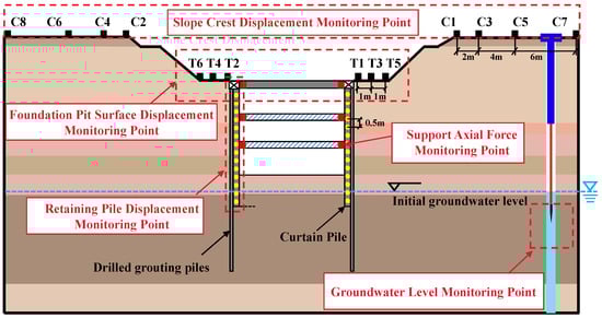 The objective is to assess the impact of staged excavation and groundwater level rise following rainfall on foundation pit stability. The overall layout of monitoring instruments is shown in Figure 3.