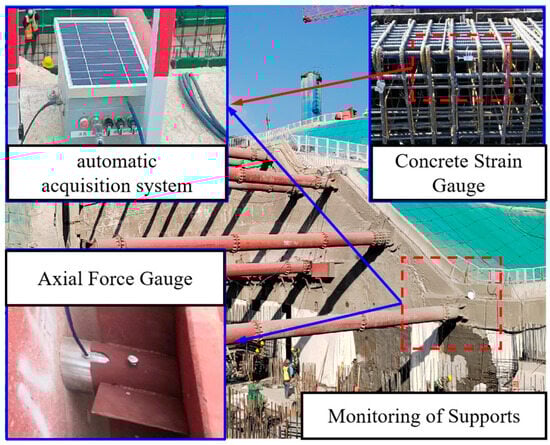 The internal support system consists of a concrete support at the top of the foundation pit and two layers of steel struts. An automatic axial force acquisition system was installed on the struts to monitor their force distribution. The installation of axial force gauges is detailed in Figure 7.