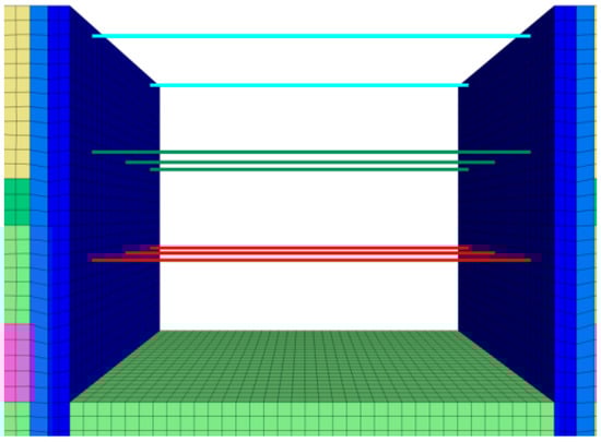According to the FLAC3D User Manual and related equivalent calculation methods [28,33], the water-stop curtain, constructed with P.O 42.5 cement-soil mixing piles of length 27.5 m, can be equivalently represented as a retaining wall with a width of 0.65 m. The bored piles, made of C30 reinforced concrete, can be equivalently modeled as retaining walls with a width of 0.8 m. The 3D numerical model of the foundation pit, retaining structure, and supports is shown in Figure 9.