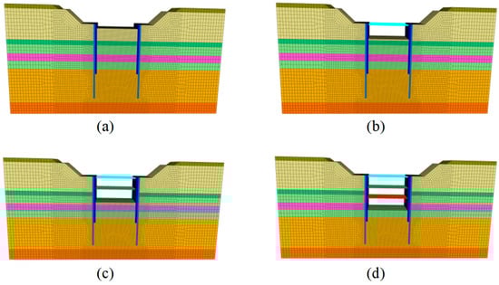 Foundation pit excavation simulation. (a) 1st-Excavation. (b) 2nd-Excavation. (c) 3ed-Excavation. (d) 4th-Excavation.