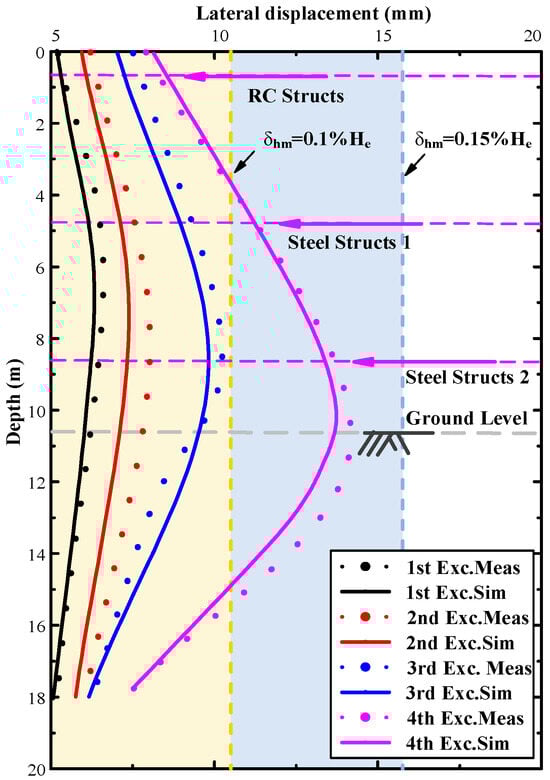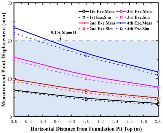 Analysis of this study reveals that the rise in groundwater level due to rainfall is a critical factor triggering excavation deformation. A comparison with a numerical case study of a multi-layered soil excavation with a similar depth of 14 m [21] shows that the maximum settlement at the excavation center falls within the range of 35–40 mm in both cases, and the settlement values decrease gradually from the center towards the periphery (Figure 24a). This result confirms that the coupled hydro-mechanical simulation is a viable method for excavation analysis.