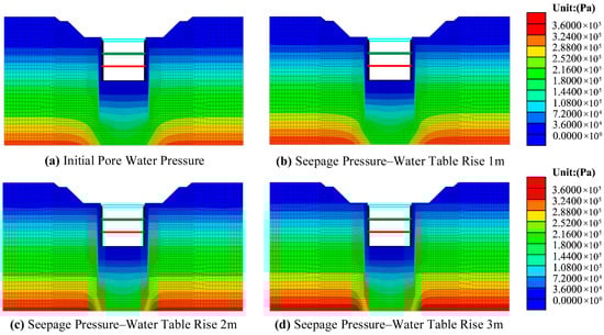 For the model mesh, a refined grid with an element size of 0.5 m is applied within one excavation width on both sides, transitioning to a coarser grid of 1.0 m beyond this zone. Regarding the stress field simulation, fixed displacement boundaries are prescribed at the model’s sides and bottom. For post-rainfall seepage analysis, the lateral boundaries are defined as permeable, with pore water pressures fixed at the cross-section. The solution convergence is set to a force imbalance tolerance of 1 × 10−5.