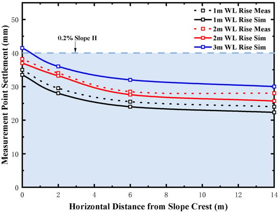 As shown in Figure 20, groundwater level rise induces settlement at the slope crest, with settlement magnitude decreasing as the distance increases. The rate of decrease gradually stabilizes. When the groundwater level rises by 3 m, the maximum settlement at the slope crest reaches 41.5 mm, approximately 0.2%H, where H represents the height from the slope crest to the foundation pit bottom.