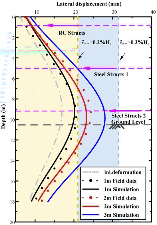As shown in Figure 22, results indicate that the displacement of the retaining piles progressively increases with the rise of the groundwater level. When the groundwater level rises to 2 m, the maximum displacement of the retaining piles, δhm, reaches 24.9 mm, with a δhm/He ratio of 0.24%, which is consistent with the range of 0.2% to 0.5% reported by Ou et al. [45]. Numerical simulations predict that when the groundwater level rises to 3 m, δhm will reach 28 mm. Moreover, at a groundwater level of 3 m, the maximum displacement occurs near the bottom of the excavation, with δhm increasing by 90% compared to the non-rainfall condition. These findings align well with existing research results [33].