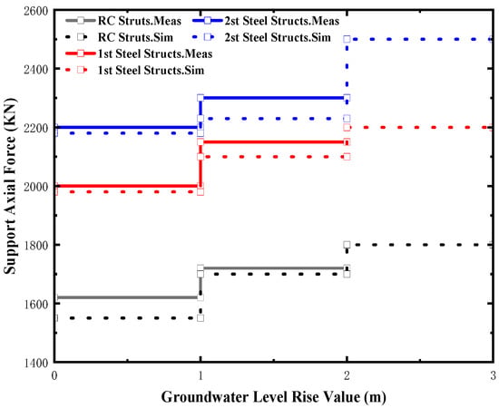 As shown in Figure 23, the study indicates that the axial force in the foundation pit supports increases significantly with the rise in groundwater level, with a maximum increase of 16%. Numerical simulation results show that when the groundwater level rises by 3 m, the axial force of the concrete support increases from 1550 kN to 1800 kN, a 16% increase; the axial force of the second steel support increases from 2180 kN to 2500 kN, a 15% increase; and the first steel support experiences the smallest increase, rising from 1980 kN to 2200 kN, an 11% increase.