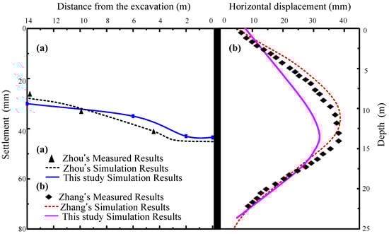 Comparison results numerical simulations and two published case records. (a) Zhou’s Results and the Present Study. (b) Zhang’s Results and the Present Study.