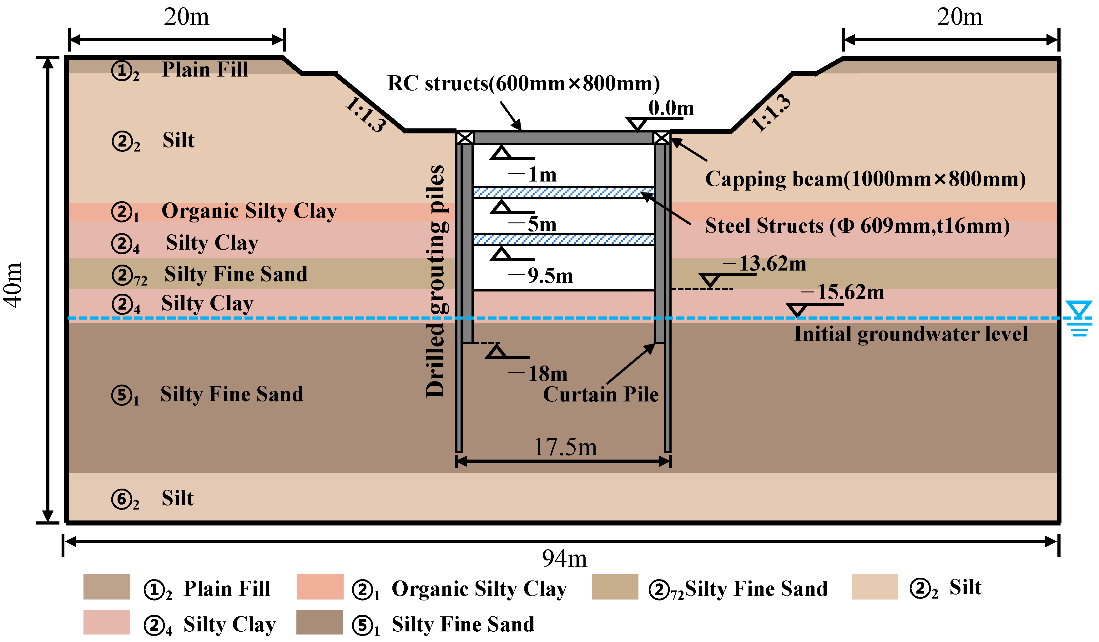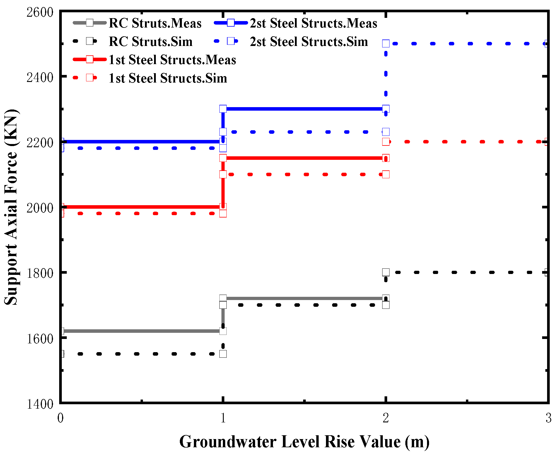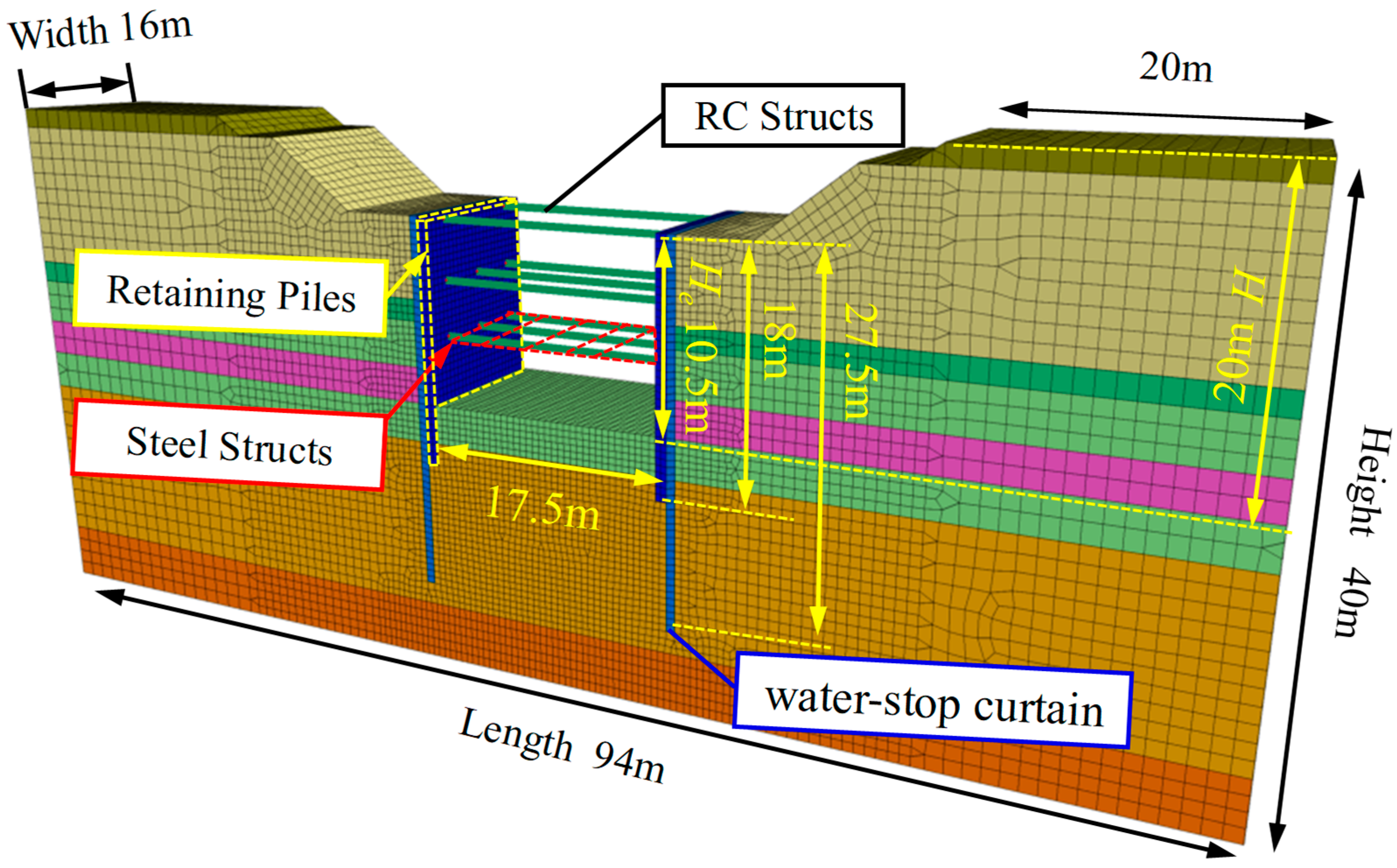 - Wang, Y.; Zhang, Y.; Li, M.; Qi, Y.; Ma, T. A numerical investigation of the deformation mechanism of a large metro station foundation pit under the influence of hydromechanical processes. Geofluids 2021, 2021, 5536137. [Google Scholar] [CrossRef]