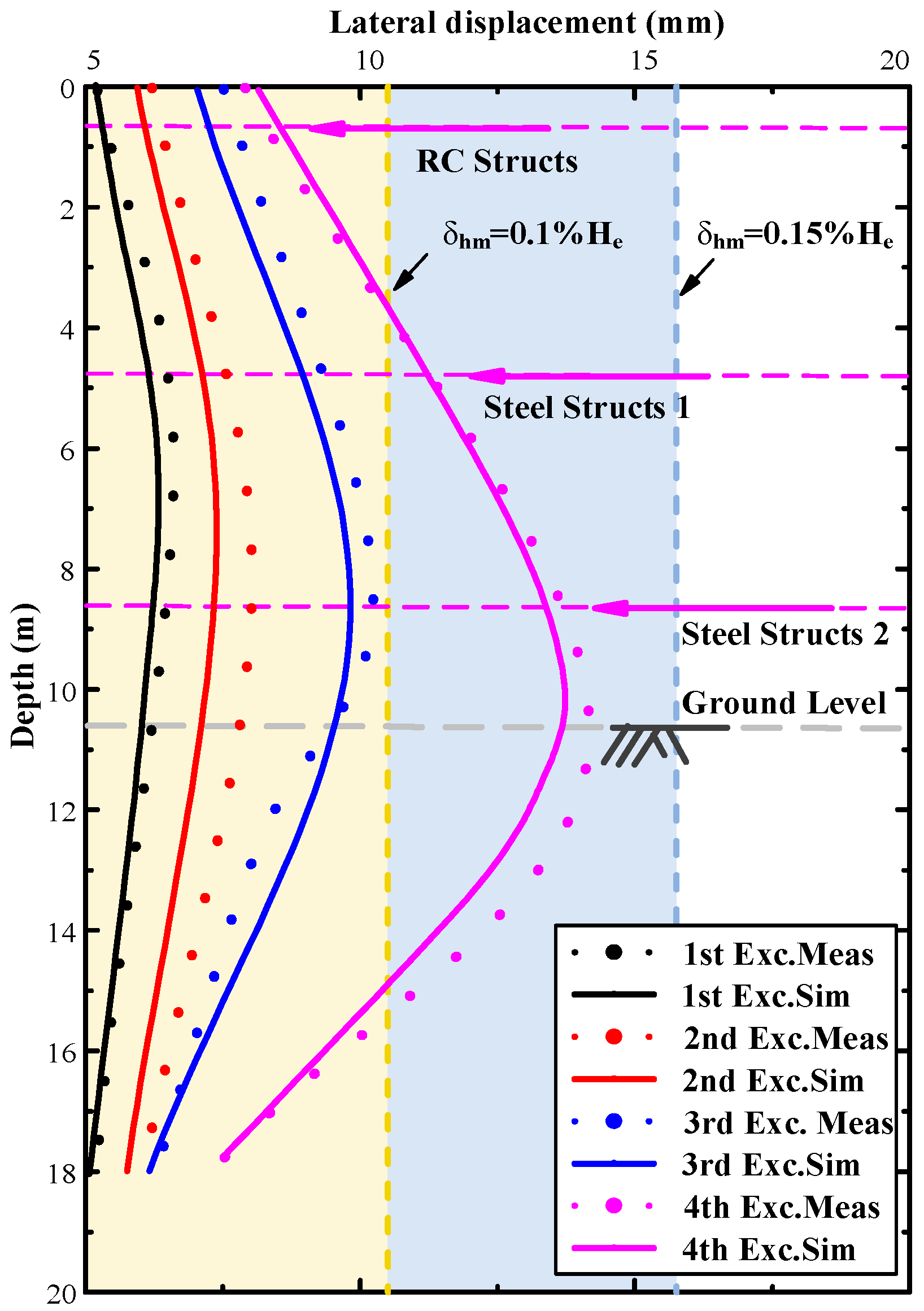 - Zhou, H.Z.; Zheng, G.; He, X.P.; Wang, E.Y.; Guo, Z.Y.; Nie, D.Q.; Ma, S.K. Numerical modelling of retaining structure displacements in multi-bench retained excavations. Acta Geotech. 2020, 15, 2691–2703. [Google Scholar] [CrossRef]