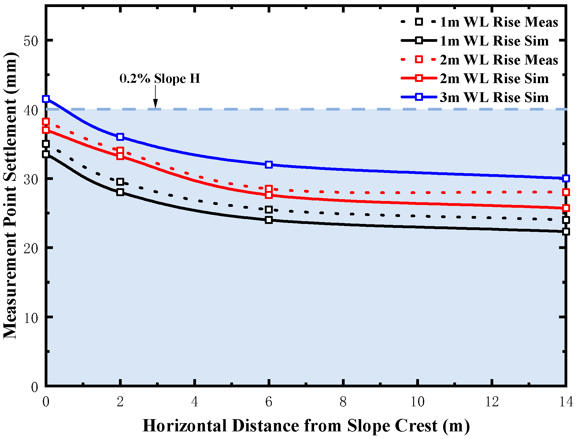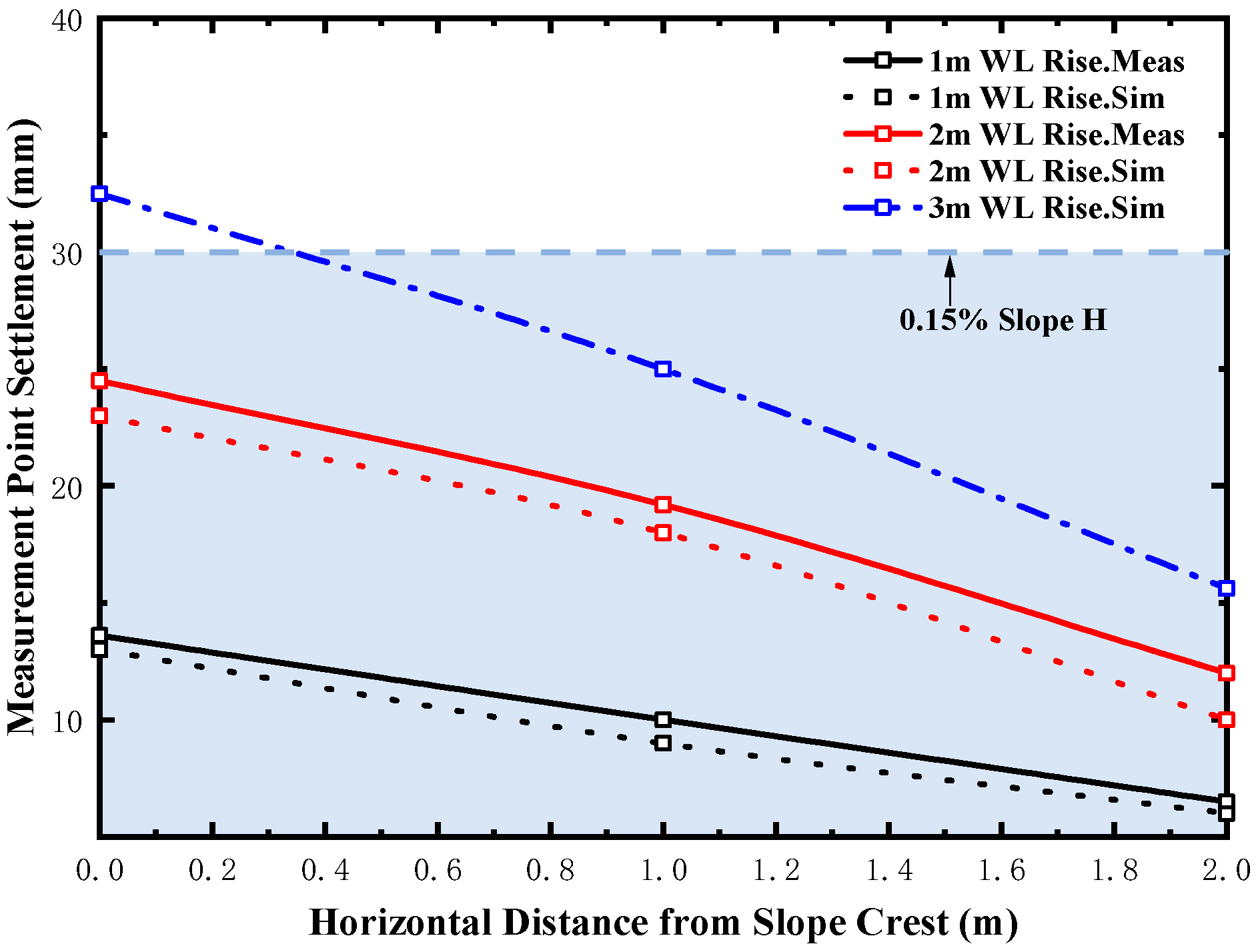 - This study quantitatively evaluates foundation pit deformation. During staged excavation, the ground surface at the slope crest exhibits an uplift near the excavation and settlement farther away, with a critical transition occurring within the range of Xt/H = 0.4~0.6. The findings also indicate that after excavation, the maximum uplift at the pit surface is approximately 0.1%H. When the groundwater level rises by 3 m (15%H), the maximum settlement at the slope crest reaches 0.2%H, while the maximum settlement at the pit surface approaches 0.15%H.