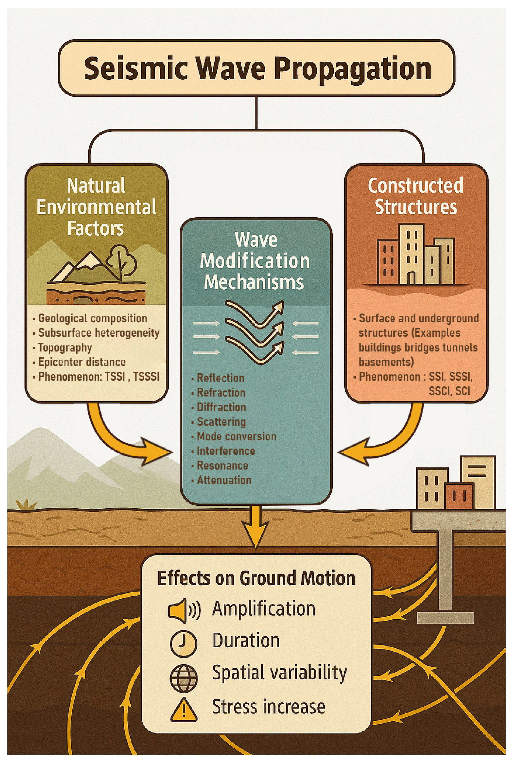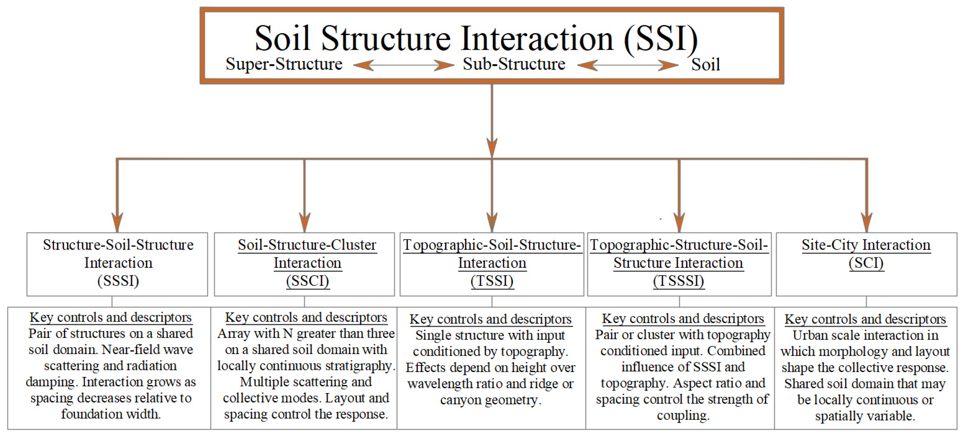 | SSI (Soil–Structure Interaction) | Dynamic interaction between a structure and surrounding soil | Soil stiffness, damping, foundation type | Soft deposits; tall/flexible structure | Reflection, amplification, resonance, attenuation |
