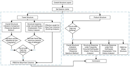 - Engineering Implications. The integrated PBSD and nonlinear analysis framework provides a practical reference for irregular high-rise buildings with discontinuous vertical systems. It achieves a rational balance between safety, economy, and functionality, offering guidance for the seismic design of complex scientific research facilities. In addition, a practical construction sequence based on the recommended design is proposed, which demonstrates the feasibility of applying the PBSD approach to real projects and enhances its engineering applicability.