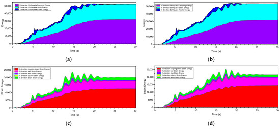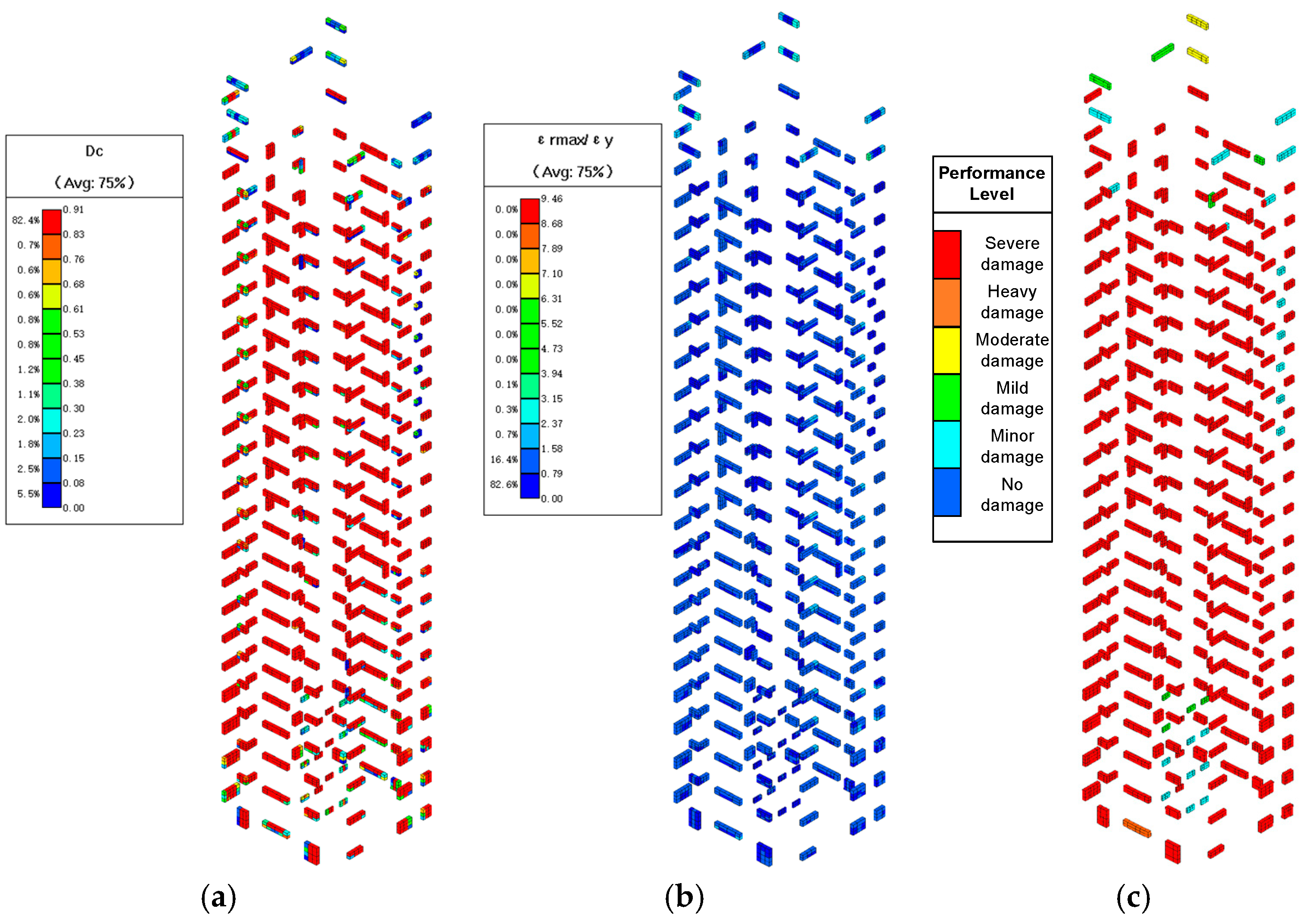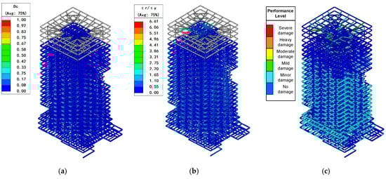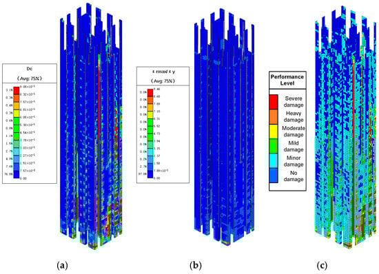 - Seismic Behavior of the Tower. Elastoplastic time-history analysis indicated that the tower remained upright under rare earthquakes, with maximum interstory drift ratios of 1/149 and 1/150 in the X and Y directions, respectively. Energy analysis revealed that damping and strain energies accounted for 50% and 40% of total input energy. The core tube remained mostly elastic, coupling beams experienced shear-dominant failure, and the outer frame showed only minor damage, forming a dual seismic defense of “core-tube dissipation and frame protection.”