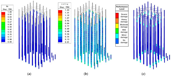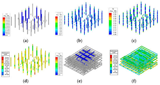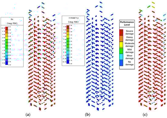 - Component Modeling: Beam-column elements adopted the fiber-bundle model, enabling interaction between axial force and bending. Shear walls and slabs were simulated using layered shell elements with distributed reinforcement layers, allowing elastic–plastic damage representation.