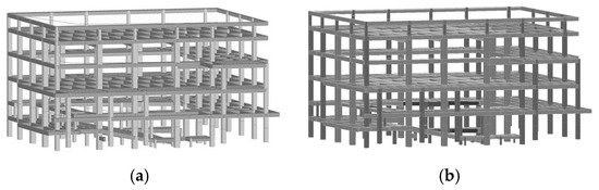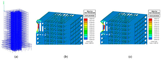 - Global Model Assembly: The overall model was generated by connecting all elements into a three-dimensional system. To account for cracking and flexibility of floors, the rigid-floor assumption was omitted, and slabs were discretized into shell elements.