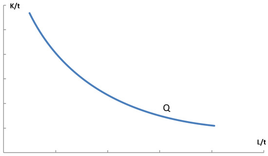 The following explanation contains the mathematical derivation of the marginal rate of technical substitution (MRTS) and the determination of the optimal combination of inputs [46]. The long-run production function is expressed by Relation (2). The marginal products (MPs) of the serving and served capital resources are defined as follows: