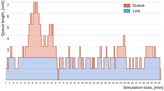 For the optimization of construction processes, a closed system (Figure 6) is more suitable, in which customers return to the system and rejoin the queue after a certain period following service completion. A closed process is understood as a situation in which the source of requests is finite. The queue length is limited, and customer requests are processed according to the FIFO principle (first in–first out). An example of such an application is the optimization of construction machinery in the earthworks stage, where loaders or excavators (number ) act as service centers, and trucks or dumpers (number ) enter the system as customers. For the maximum queue length, the following relation applies: