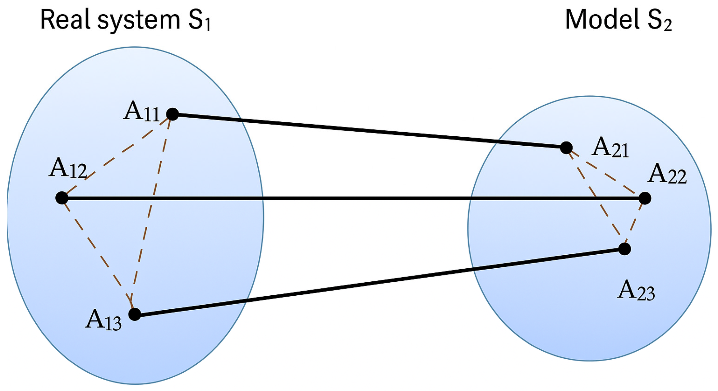 Each mathematical model examined in this study constitutes an isomorphic representation of a real physical object, incorporating certain abstractions that simplify the model and emphasize selected properties and parameters (see Figure 1). In isomorphic systems, the mapping of elements from one system S1 to another system S2 is bijective, and the number of nodes, edges, and their degrees is identical. This condition fully satisfies the requirements of accurate modeling of construction technological processes.
