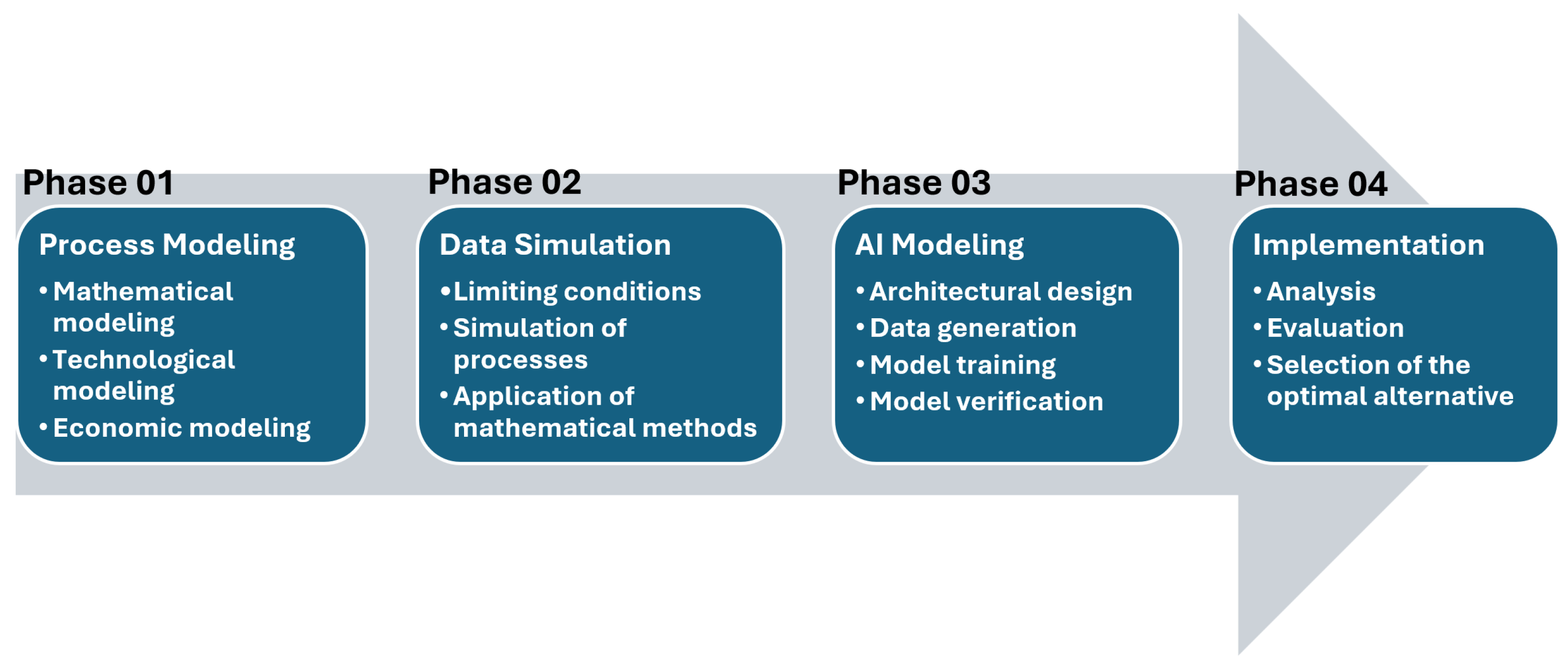 - Phase 02: The simulation of synthetic data for AI training (the definition of limiting constraints, the application of mathematical methods such as queueing theory and the Monte Carlo method, and the simulation of processes).