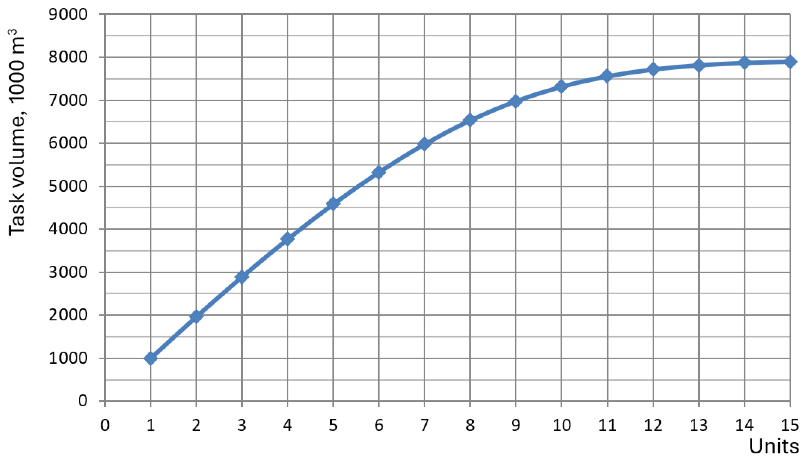 The contractor usually has only a limited working area—the construction site—and must cope with a wide range of concurrent construction processes in various terrain conditions. These processes often intersect and interfere with one another. Furthermore, each production indicator requires a minimum working space on the site. The ratio of the minimum working space to the total working space for a given production factor determines the working front coefficient, one of the fundamental limiting parameters in the spatial structure of a construction project. The minimum working front defines the lower boundary of the number of machines or crews that construction management can allocate to complete a given task [47]. The working front coefficient is calculated according to Equation (18) and is usually expressed as a percentage.