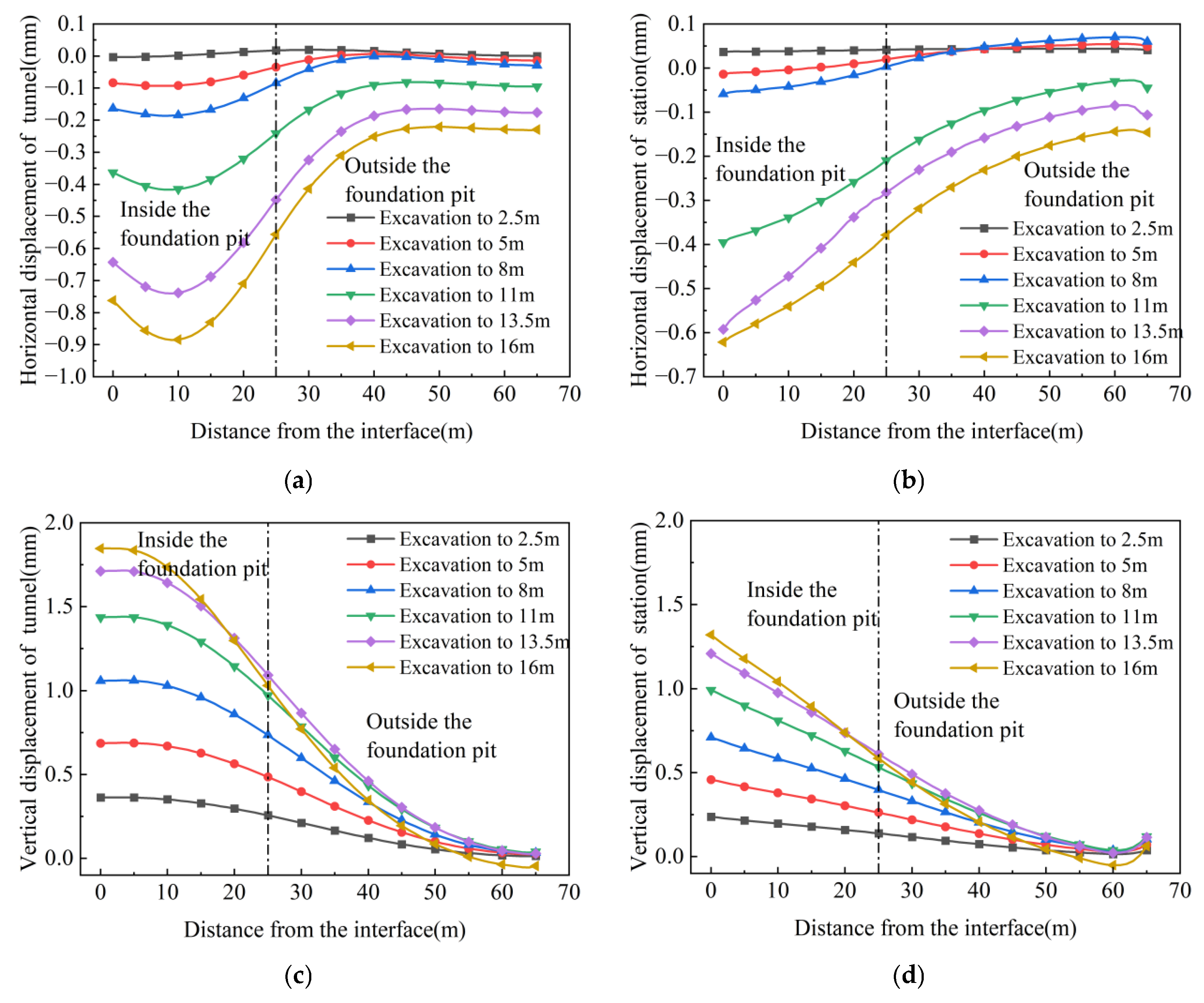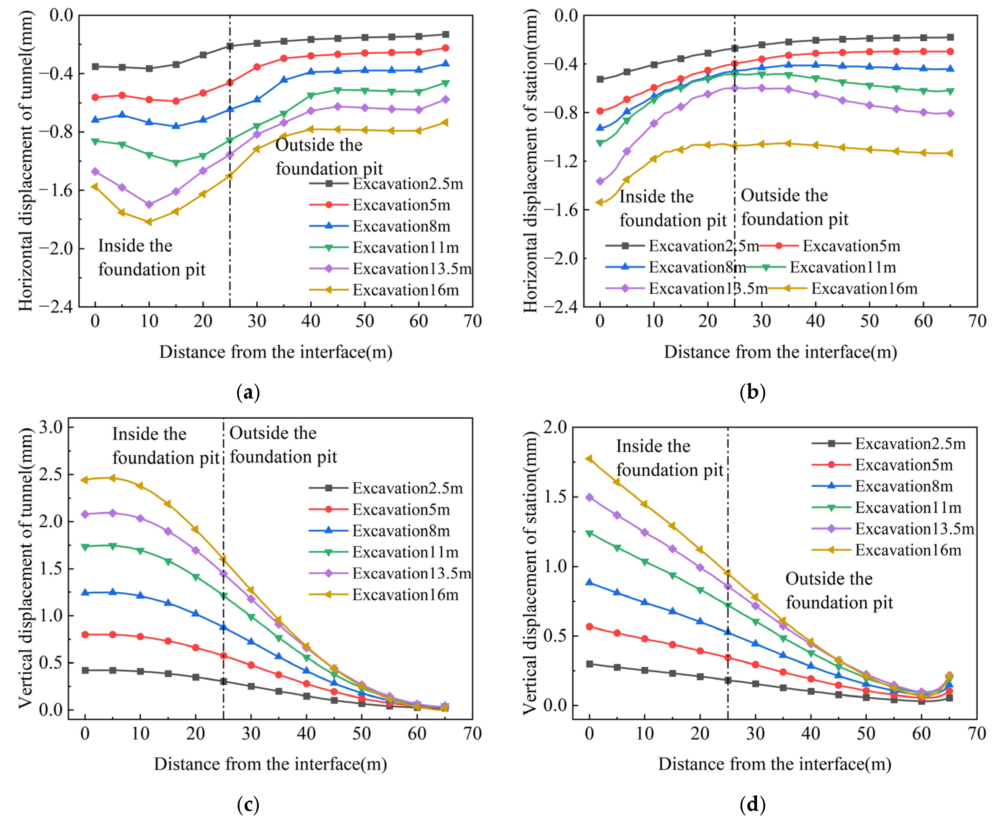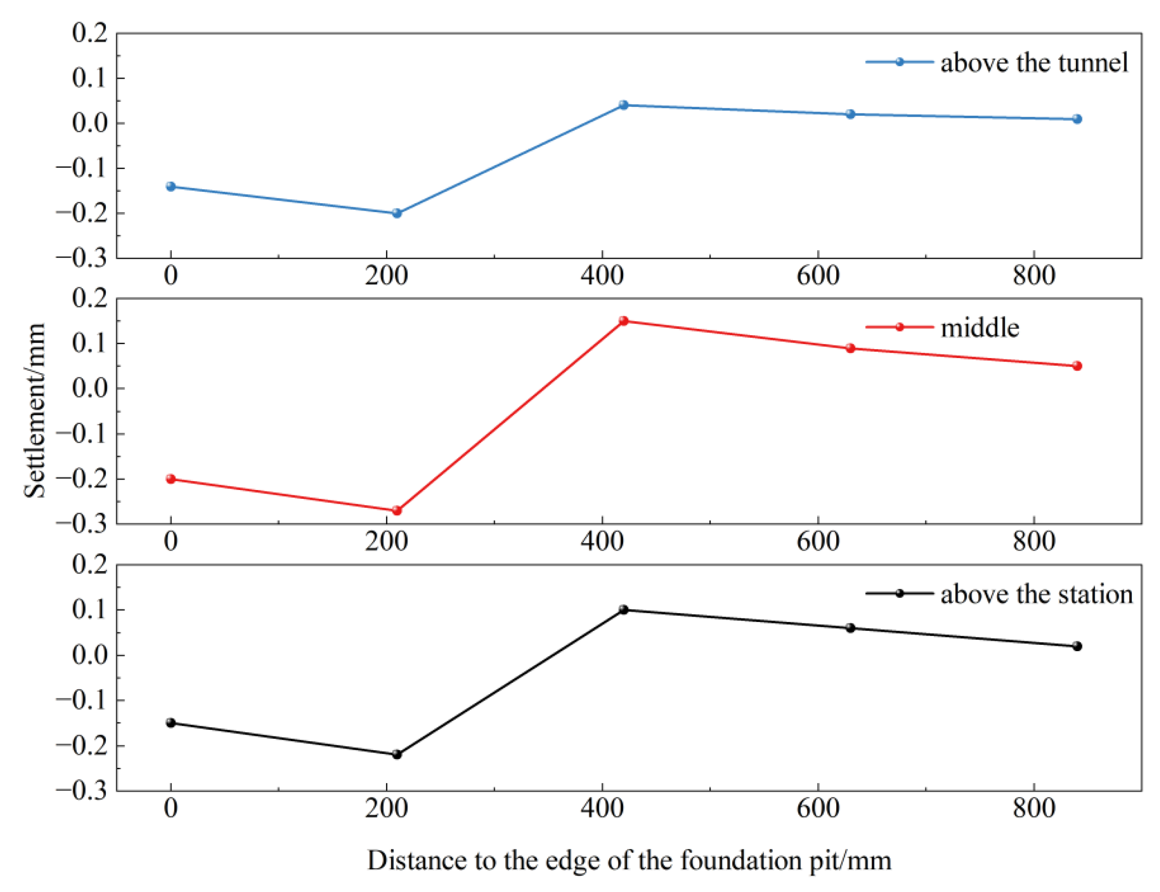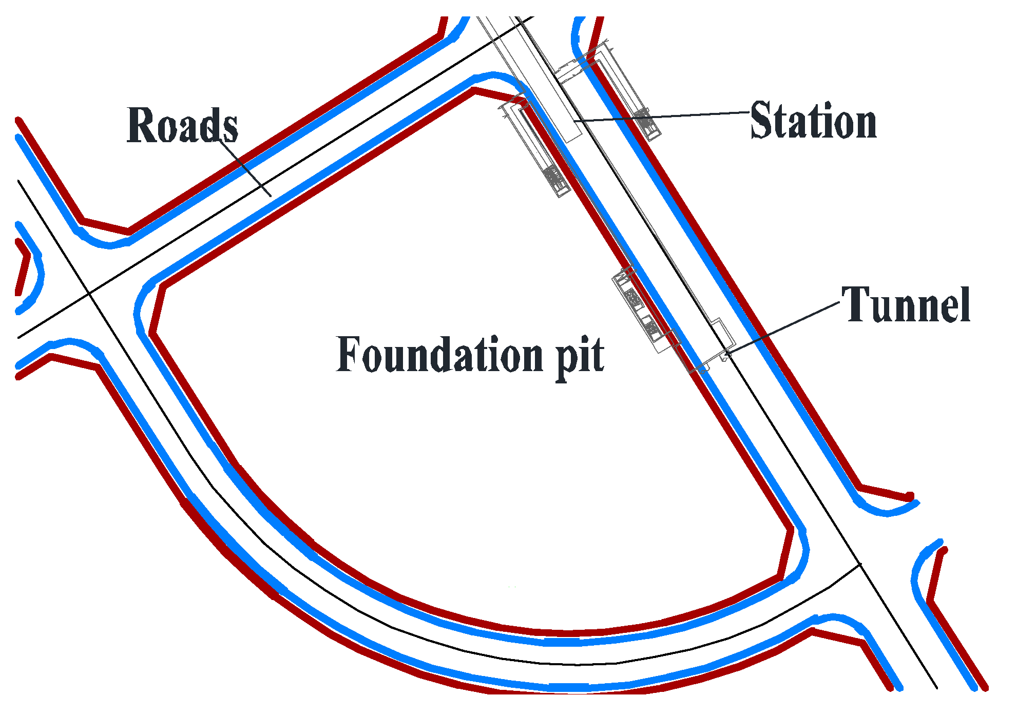 - Foundation pit excavation induced settlement of the surrounding ground surface. The heave of the subway structure caused a slight heave of the soil above the tunnel and station; in contrast, the soil between the subway structure and support structure underwent slight settlement, which was due to soil relaxation caused by the unloading effect of foundation pit excavation.