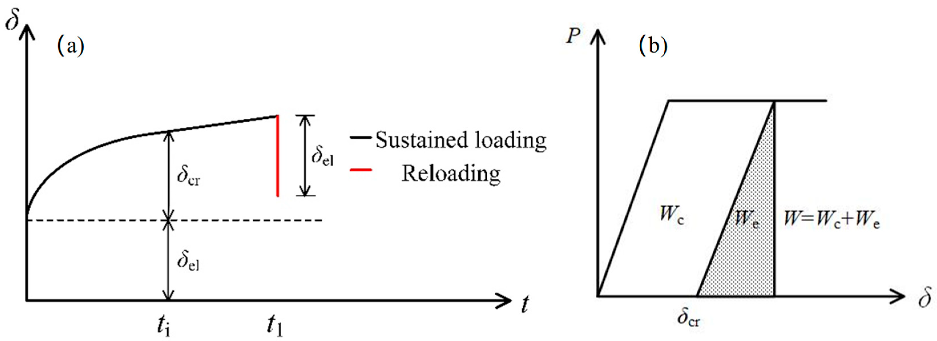 To characterize the time-dependent crack extension behavior, the energy dissipation during creep deformation must be accounted for under sustained loads. Han et al. [16] formulated a tension-softening constitutive model that quantifies the interrelationships among sw, loading duration, and COD during sustained loading processes. In 3-p-b creep fracture tests conducted at various load levels, all external work is consumed by viscoelastic deformation, comprising both elastic and creep components. Figure 1 illustrates the schematic deflection versus time (δ-t) and load versus deflection (P-δ) curves, where δel and δcr denote the elastic and creep deformations, respectively, such that the total deformation is δ = δel + δcr. Upon unloading at time t1, a portion of deformation (approximately equal to δel) is immediately recovered. Let W represent the work exerted by the external force and We the elastic strain energy of the creep specimen, the energy (Wc) dissipated by creep deformation is then given by: