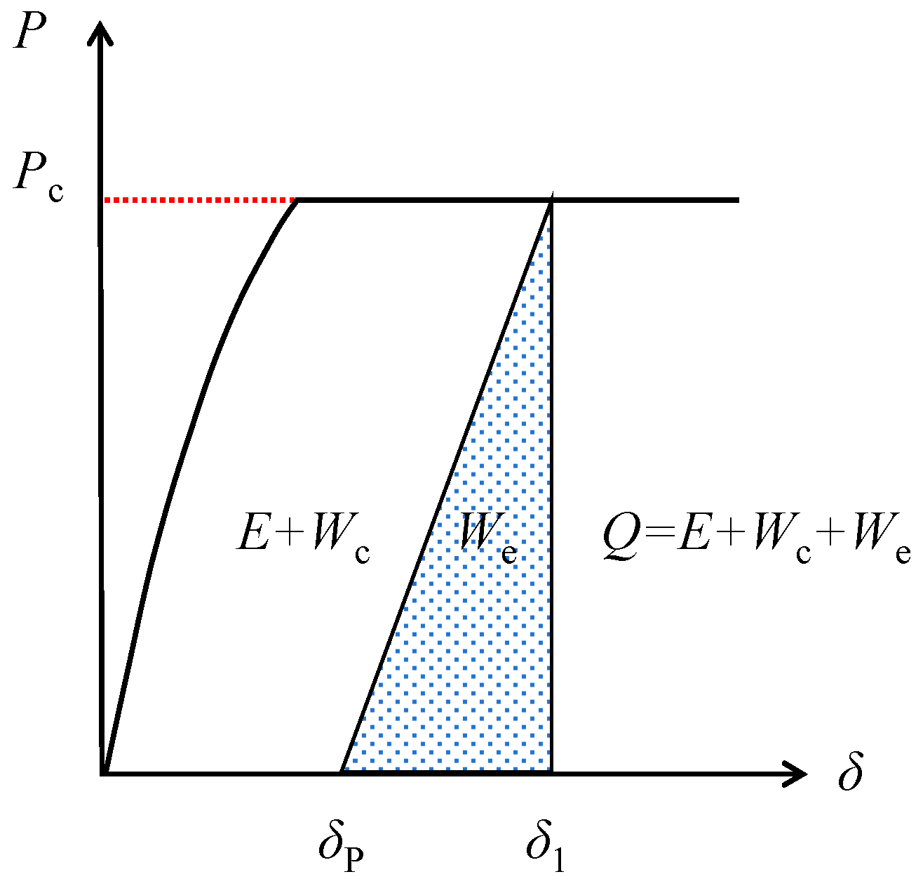 Figure 2. P versus δ response subjected to creep fracture. Pc is constant load; Q is the work contributed by external force; E is the energy for crack extension; δp is residual deformation after unloading; and δ1 is the creep deformation.