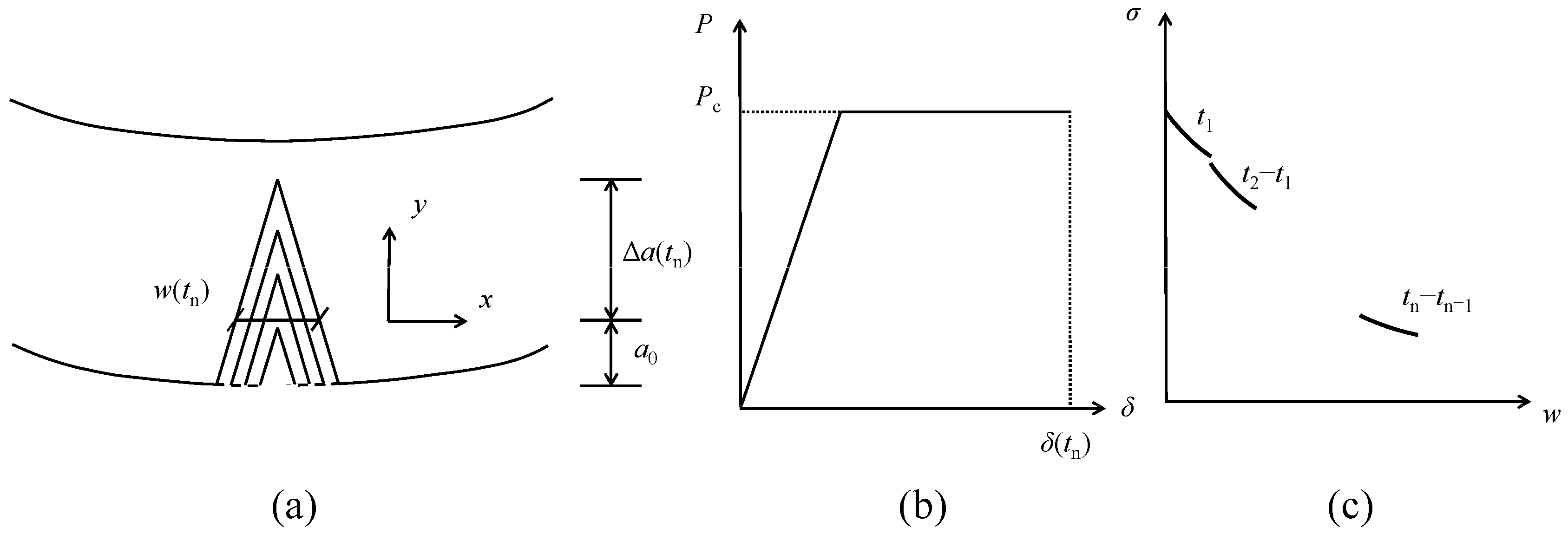 where e t n i + 1 , w 1 Δ a ( t i ) Δ a ( t n ) denotes the energy consumption per unit crack extension area corresponding to the crack-tip COD of 1 Δ a ( t i ) Δ a ( t n ) , and e t n i , w 1 Δ a ( t i ) Δ a ( t n ) represents the corresponding energy at the initial crack tip opening displacement of and time tn−i. The principle of continuity fundamentally requires that: