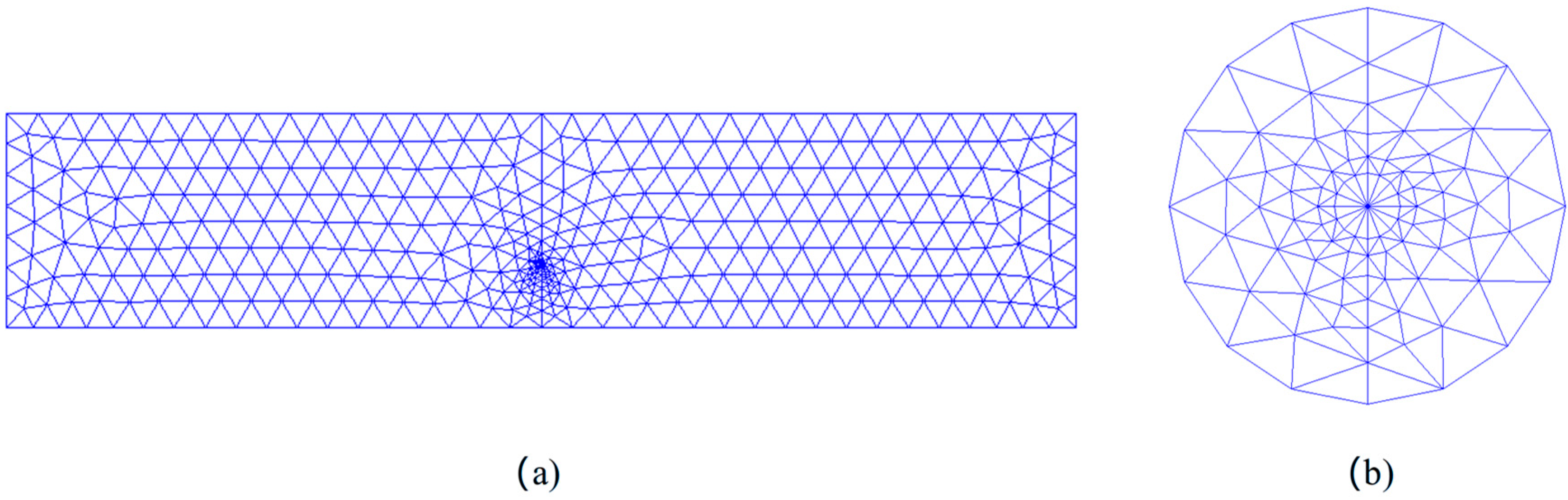 In the numerical study, the simulation of the complete time-dependent crack extension process of concrete under sustained loads was employed using ANSYS 15.0, where a plane stress model with thickness t was considered. High-order triangular elements (Plane 183) were utilized, featuring a circular refined mesh region of radius r centered at the crack tip. Herein, singular elements were embedded around the tip to address the stress singularity while dense elements were utilized to characterize the nonlinear crack-tip stress field. The boundary conditions constrained left-support nodes horizontally and vertically, and right-support nodes vertically only. A sustained load Pc is applied at the loading point. The mesh division of the complete beam model and the local crack-tip are presented in Figure 4.