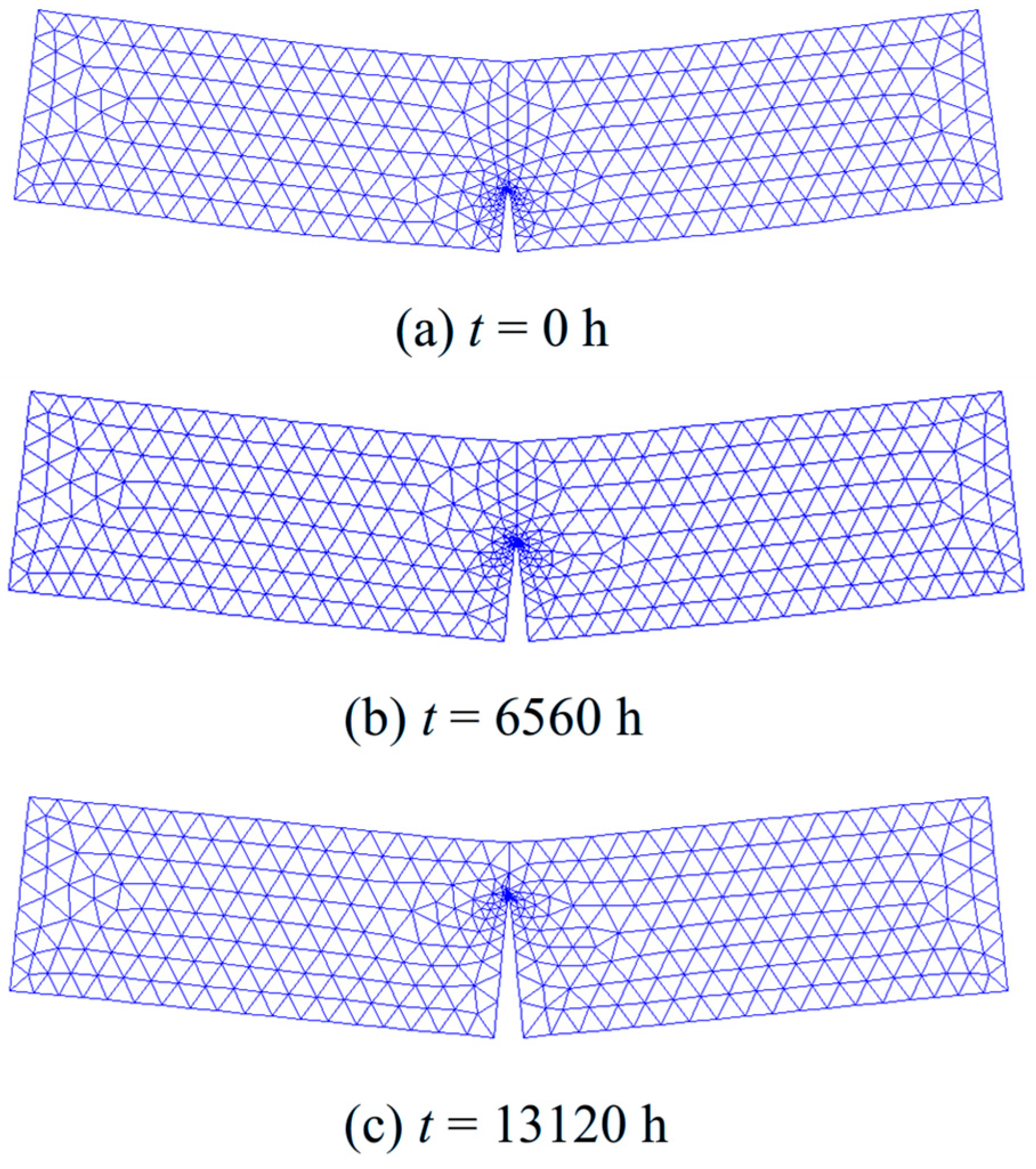 Figure 5. Deformation diagram for 3-p-b specimen S-0.90 obtained from numerical analysis, where t is the loading time in hours (h). Crack propagation at the time (a) t = 0 h; (b) t = 6560 h; and (c) t = 13,120 h.