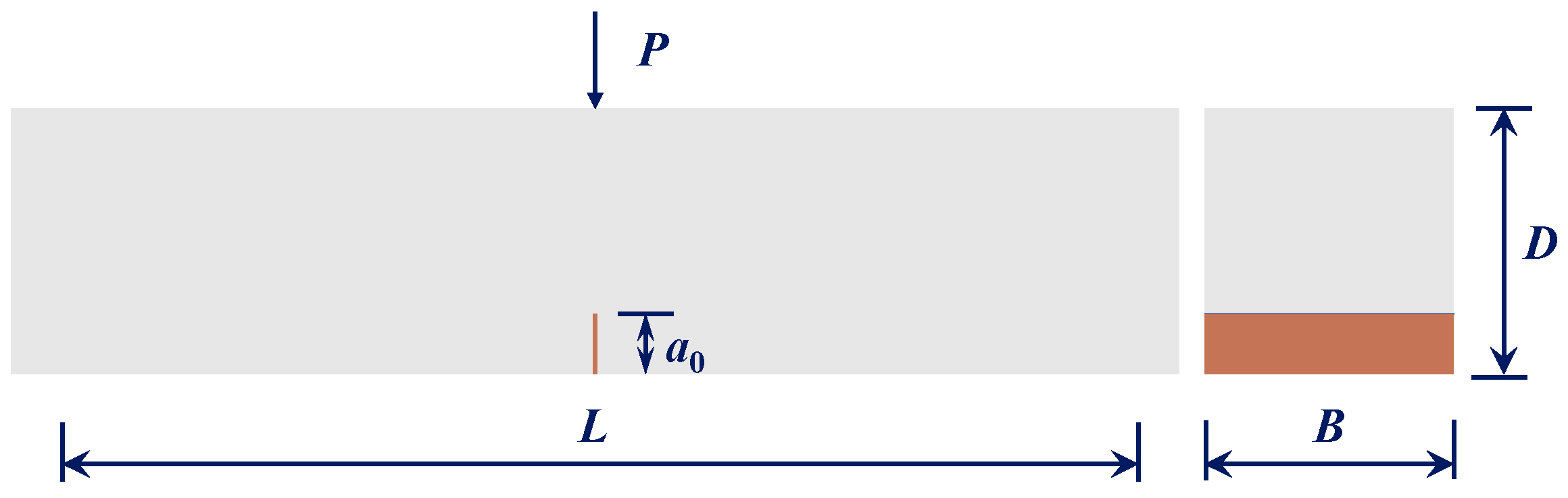 where W0 is the area under the load–displacement (P-δ) curve; δmax is the loading-point displacement at failure; mg is the self-weight of the specimen between the supports; B is the beam width; D is the beam height; and a0 is the initial crack length.