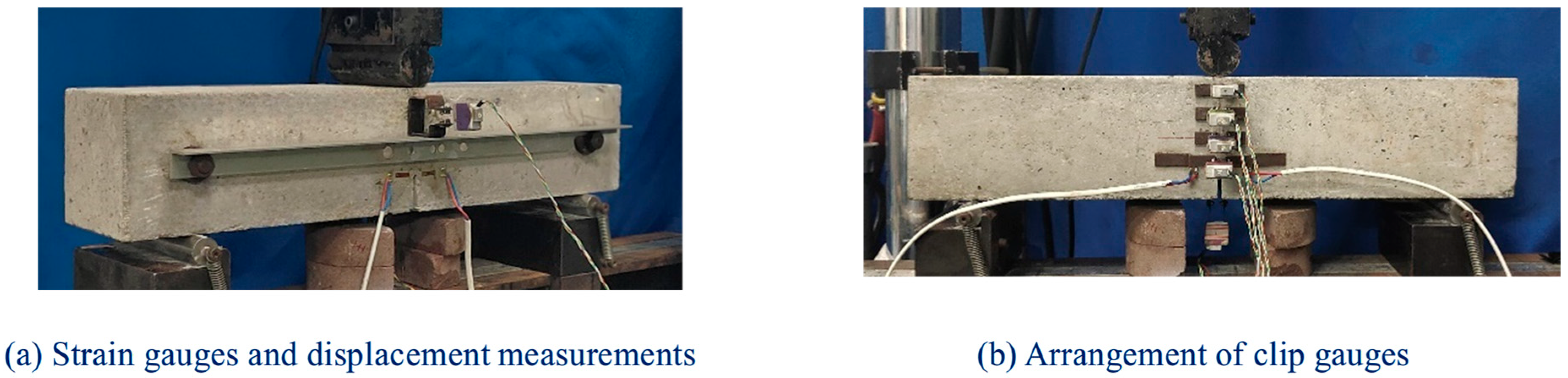 As shown in Figure 9, strain gauges were mounted on both sides of the initial crack tip to determine the initial cracking load (Pini). A clip gauge was positioned at the load application point to measure the loading-point displacement (δ). A clip gauge was located at the crack mouth to measure the crack mouth opening displacement (CMOD), while four additional clip gauges, spaced at 20 mm intervals along the ligament, were used to monitor the crack opening displacements (CODs) at various locations. Throughout the experiment, an Integrated Measurement and Control (IMC) system was employed to record the load, strain, and CODs at a sampling rate of 50 Hz. The crack extension length was calculated through linear regression analysis to the COD measurements.