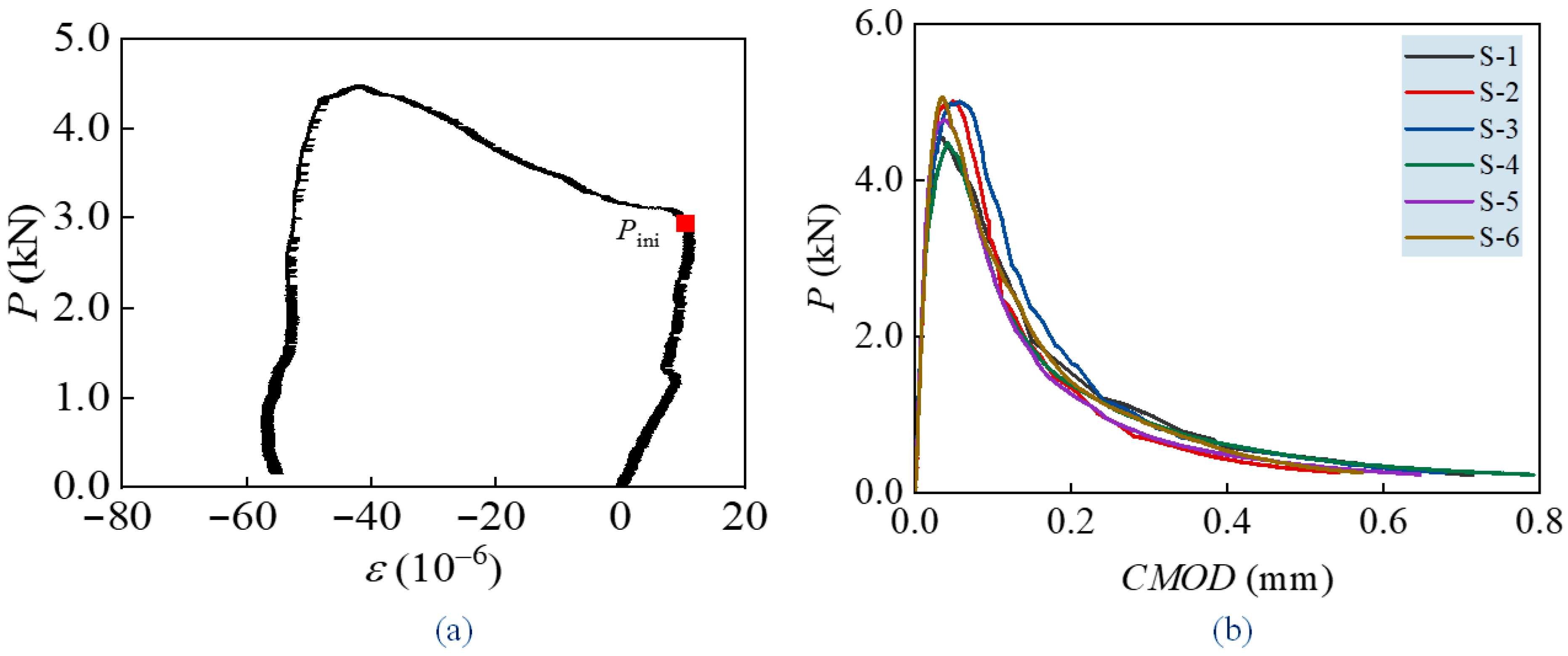 The onset of cracking was detected through a characteristic abrupt drop in strain gauge readings, resulting from the rapid release of accumulated elastic strain energy at the crack tip. Figure 10a presents the relationship between P and the crack-tip strain (ε) of Specimen S-1, where the distinct inflection point corresponds precisely to Pini. Figure 10b presents the P-CMOD curves derived from the tests for six samples (S-1 to S-6). The curves demonstrate consistent Pmax values across all specimens with acceptable errors, confirming the reliability of the specimen preparation and testing procedures. From these P-CMOD responses, two critical loads Pini and Pmax can be directly determined.