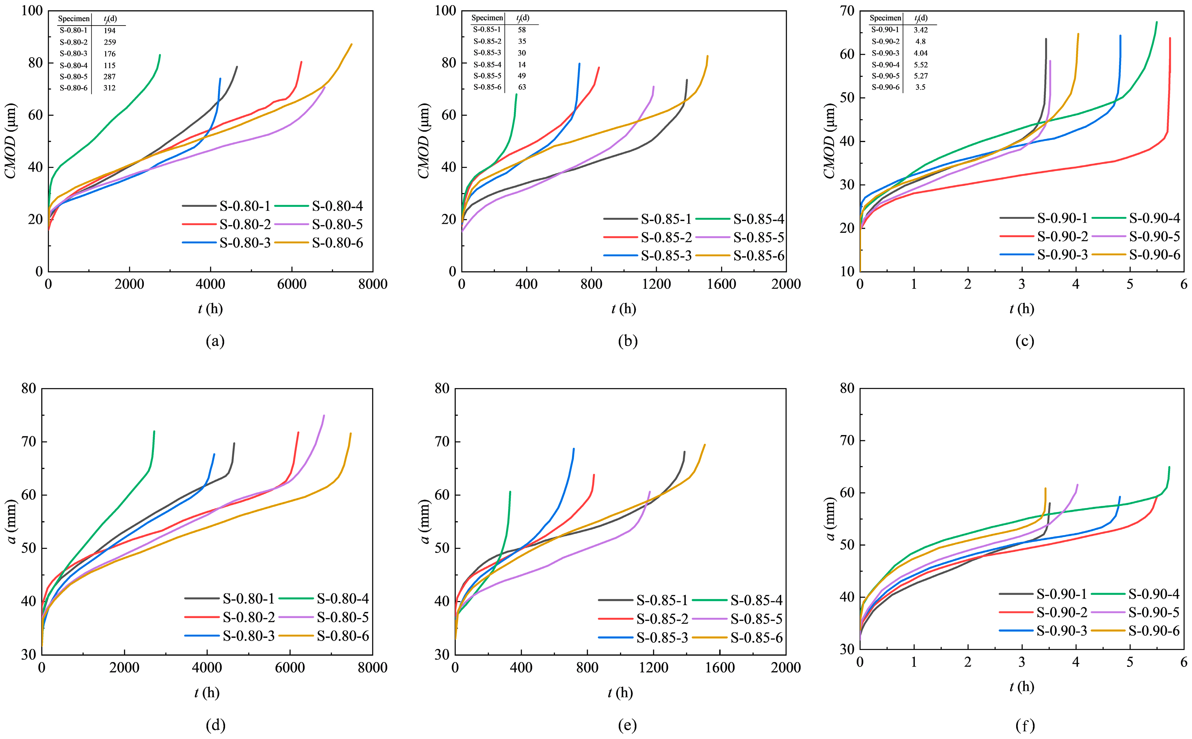 Figure 12. Test results of CMOD versus t curve and crack length versus t curve for different load levels [16]. (a) CMOD-t curve for specimen S-0.80; (b) CMOD-t curve for specimen S-0.85; (c) CMOD-t curve for specimen S-0.90; (d) a-t curve for specimen S-0.80; (e) a-t curve for specimen S-0.85; and (f) a-t curve for specimen S-0.90.