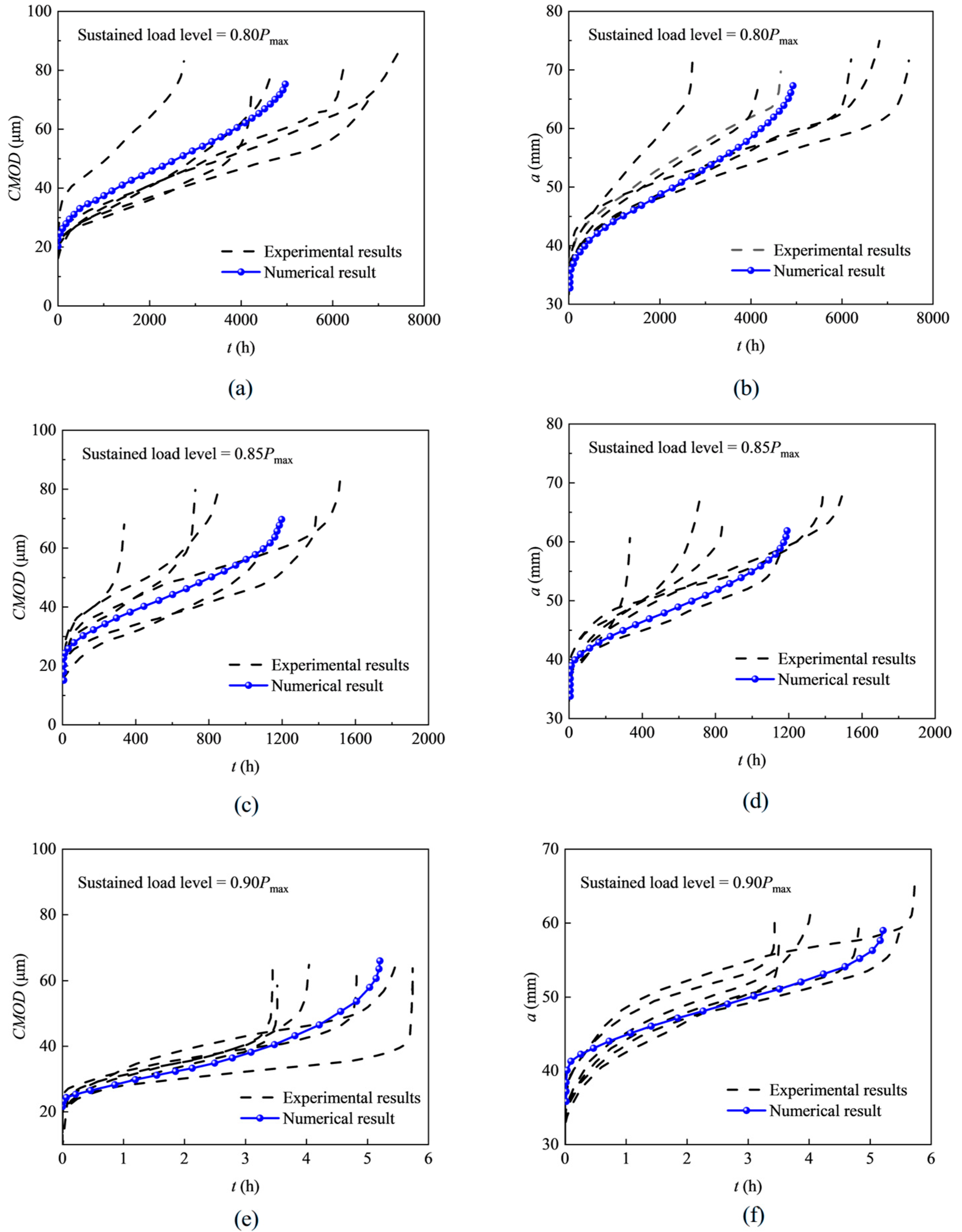 Figure 13. Comparison between experimental and numerical results under different load levels: (a) CMOD-t curve for specimens S-0.80; (b) a-t curve for specimens S-0.80; (c) a-t curve for specimens S-0.85; (d) a-t curve for specimens S-0.85; (e) CMOD-t curve for specimens S-0.90; and (f) a-t curve for specimens S-0.90.