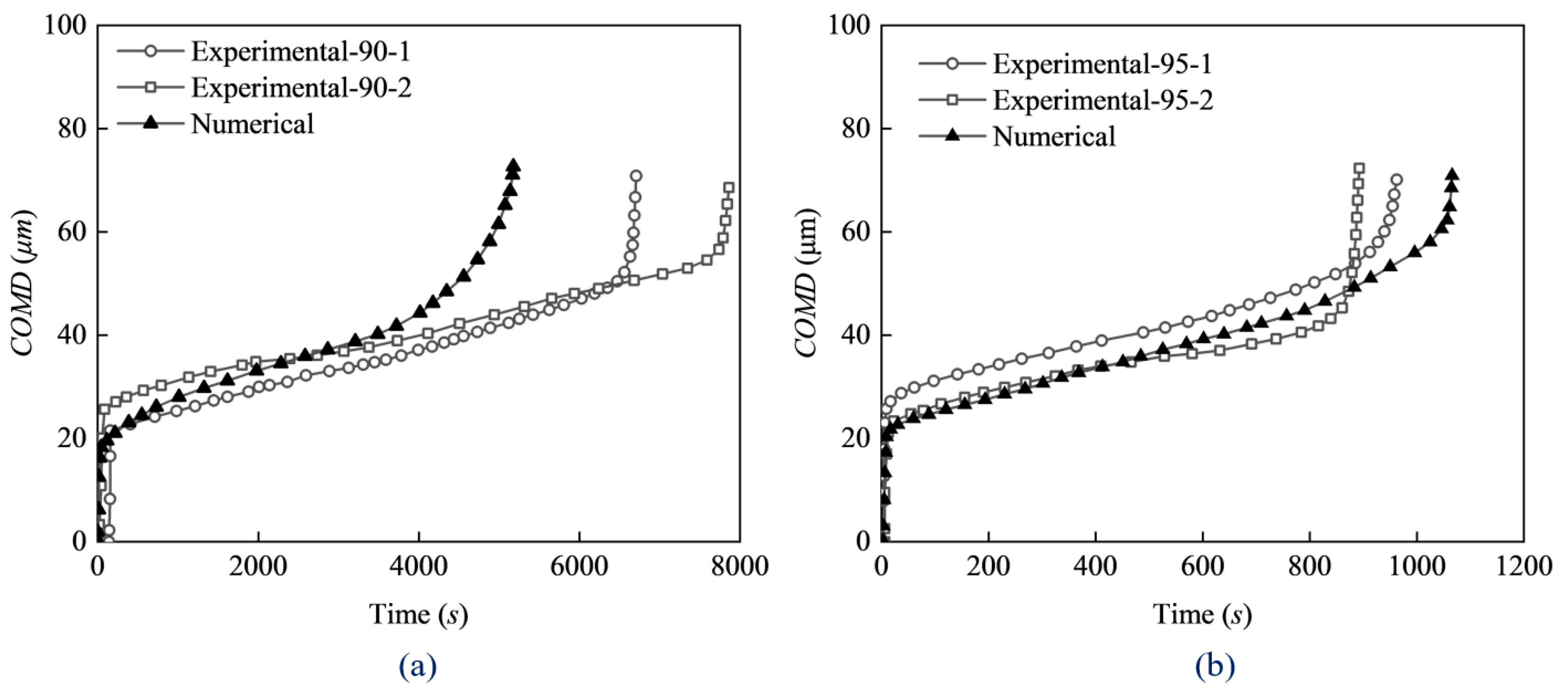 Figure 14. Comparison of CMOD-t curve obtained from numerical analysis and Li et al. [21]’s test. (a) specimen under creep load of 90% Pmax; and (b) specimen under creep load of 95% Pmax.