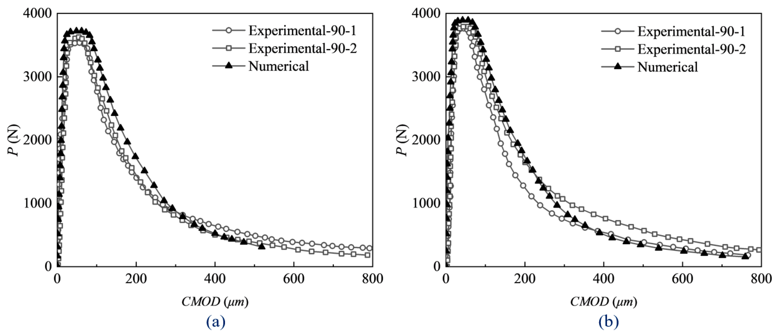 Figure 15. Comparison of P-CMOD curve obtained from numerical analysis and Li et al. [21]’s test. (a) specimen under creep load of 90% Pmax; and (b) specimen under creep load of 95% Pmax.