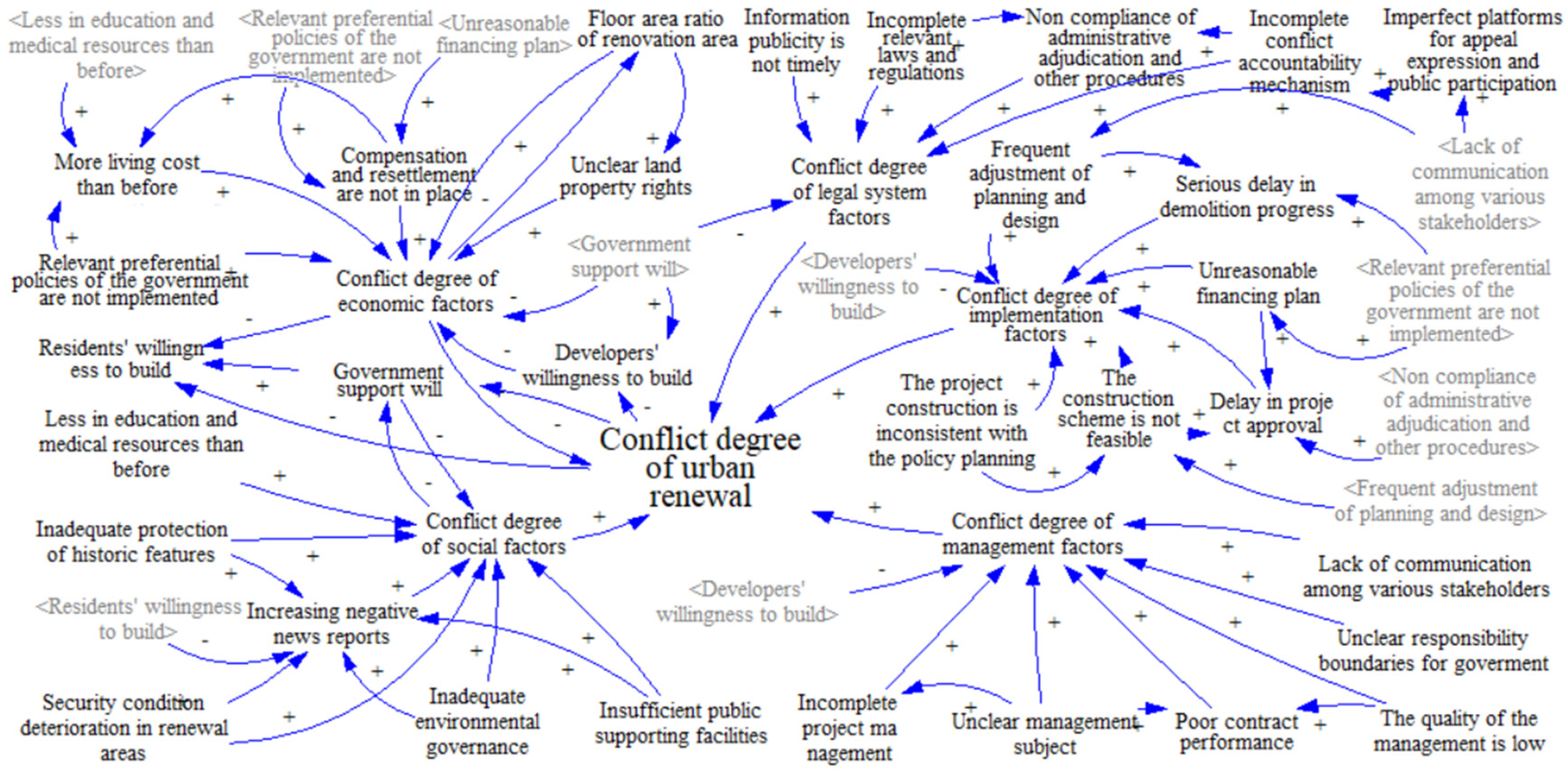 - Conflict degree of implementation factors ↑→ Conflict degree of urban renewal ↑→ Willingness of government support ↓→ Conflict degree of economic factors ↑→ Willingness of residents to build ↓→ Willingness of developers to build ↓→ Conflict Degree of implementation factors ↑.
