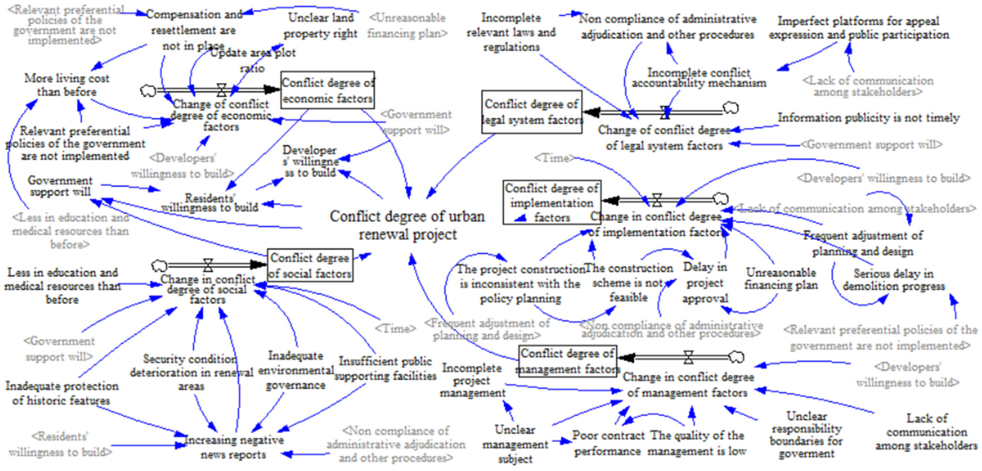 - Conflict degree of economic factors ↑→ Residents’ willingness to build ↓→ Developers’ willingness to build ↓→ Conflict degree of management factors ↑→ Conflict degree of urban renewal ↑→ Conflict degree of economic factors ↑.