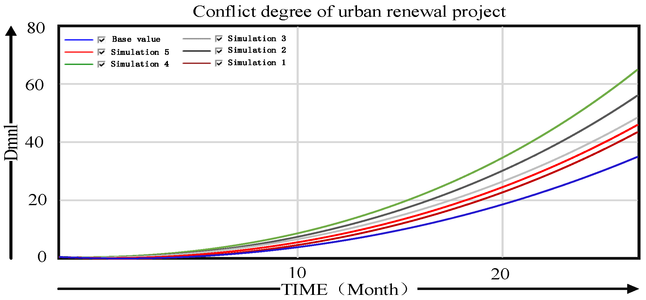 - In Simulation 3, only the assignment of legal system factors was altered based on the initial value, thereby enhancing their role in project conflict. The results indicate a significant increase in project conflict degree compared to the initial state.
