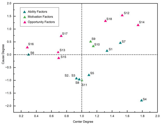 After obtaining the direct influence matrix, the normalized comprehensive influence matrix was derived using Equations (1) and (2). Subsequently, the impact degree, center degree, and cause degree of each factor were calculated through Equations (3)–(6). The results are presented in Table 3. Factors with a cause degree > 0 are classified as cause factors, while those with cause degree ≤ 0 are categorized as effect factors. Causal factors exert significant influence on other factors in the system, whereas effect factors are more susceptible to being influenced by causal factors. Higher center degree indicates greater importance of a factor, necessitating prioritized management attention. Based on this, a causal factor relationship diagram was plotted with centrality on the horizontal axis and cause degree on the vertical axis, as shown in Figure 2.