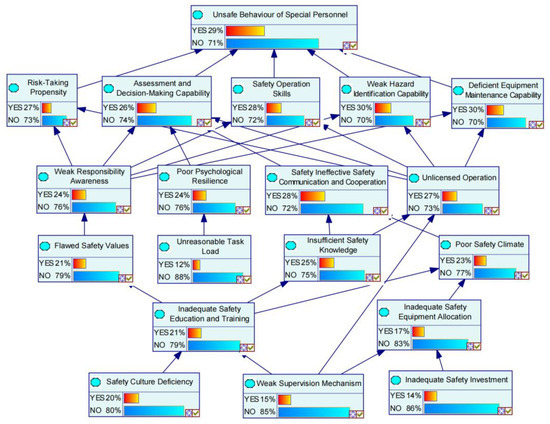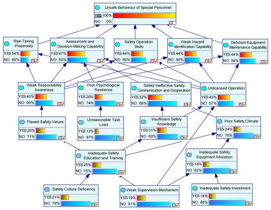 First, based on the constructed multi-level hierarchical interpretative structural model of causal factors for unsafe behaviors in special operations personnel, the structural model was converted using Bayesian network software GeNIe 3 to establish a BN structural model for unsafe behaviors. Experts defined two states for each factor: Occurrence (YES) and Non-occurrence (NO), with initial state probabilities uniformly assigned as 1/2. Using expert knowledge and historical experience, the initial probabilities of parent nodes and conditional probabilities between nodes were determined to establish Conditional Probability Tables (CPTs) reflecting dependency relationships. Due to the complexity of individual CPTs and space limitations, these tables are not elaborated here. After importing the acquired prior probabilities of parent nodes and inter-node conditional probabilities, probability updating calculations yielded the Bayesian network topology shown in Figure 4. Then, utilizing the fault diagnosis function of the constructed BN structural model for unsafe behaviors, the occurrence probability of the node “Unsafe Behavior of Special Operations Personnel” was set to 100% to infer the posterior probability of each factor, as shown in Figure 5.