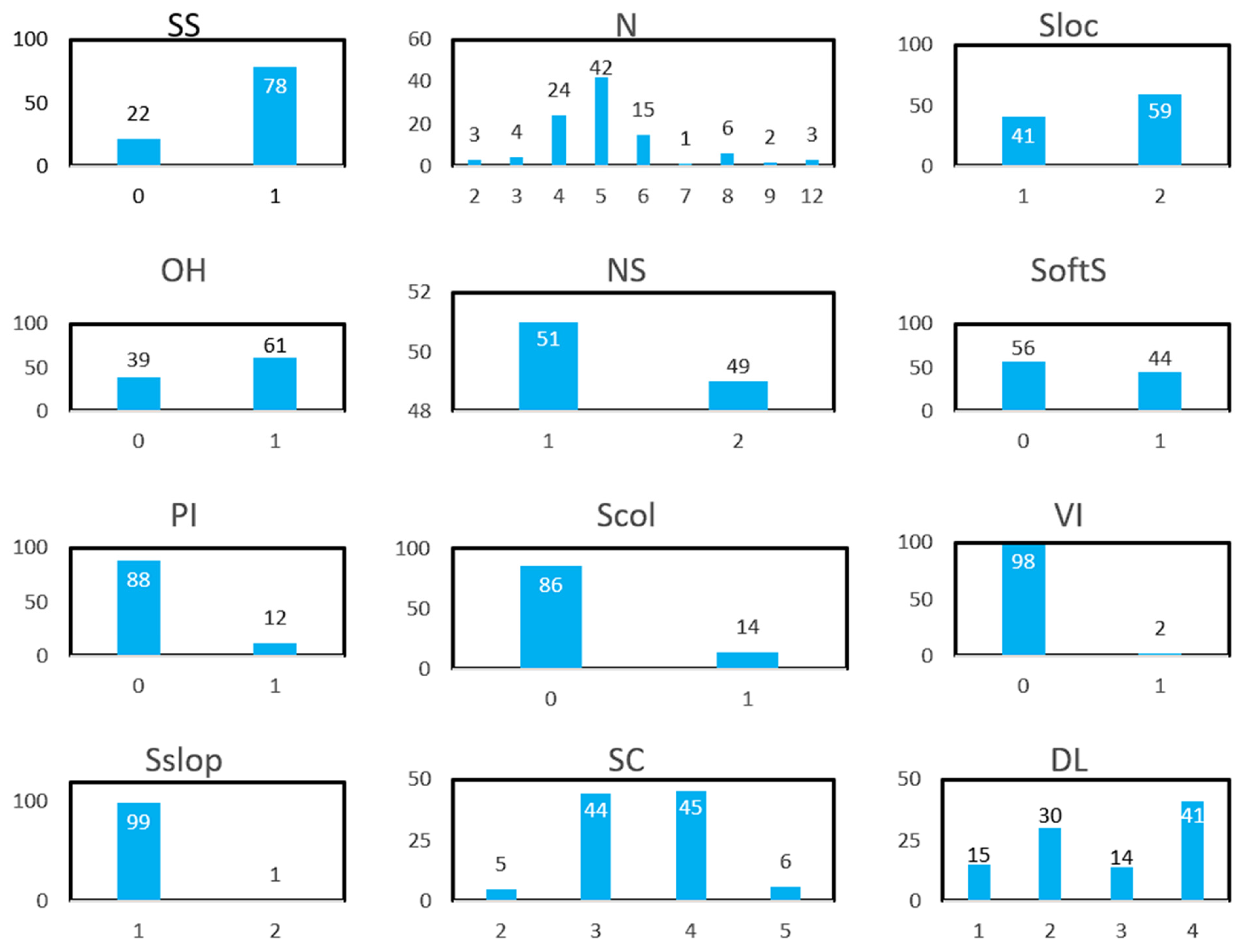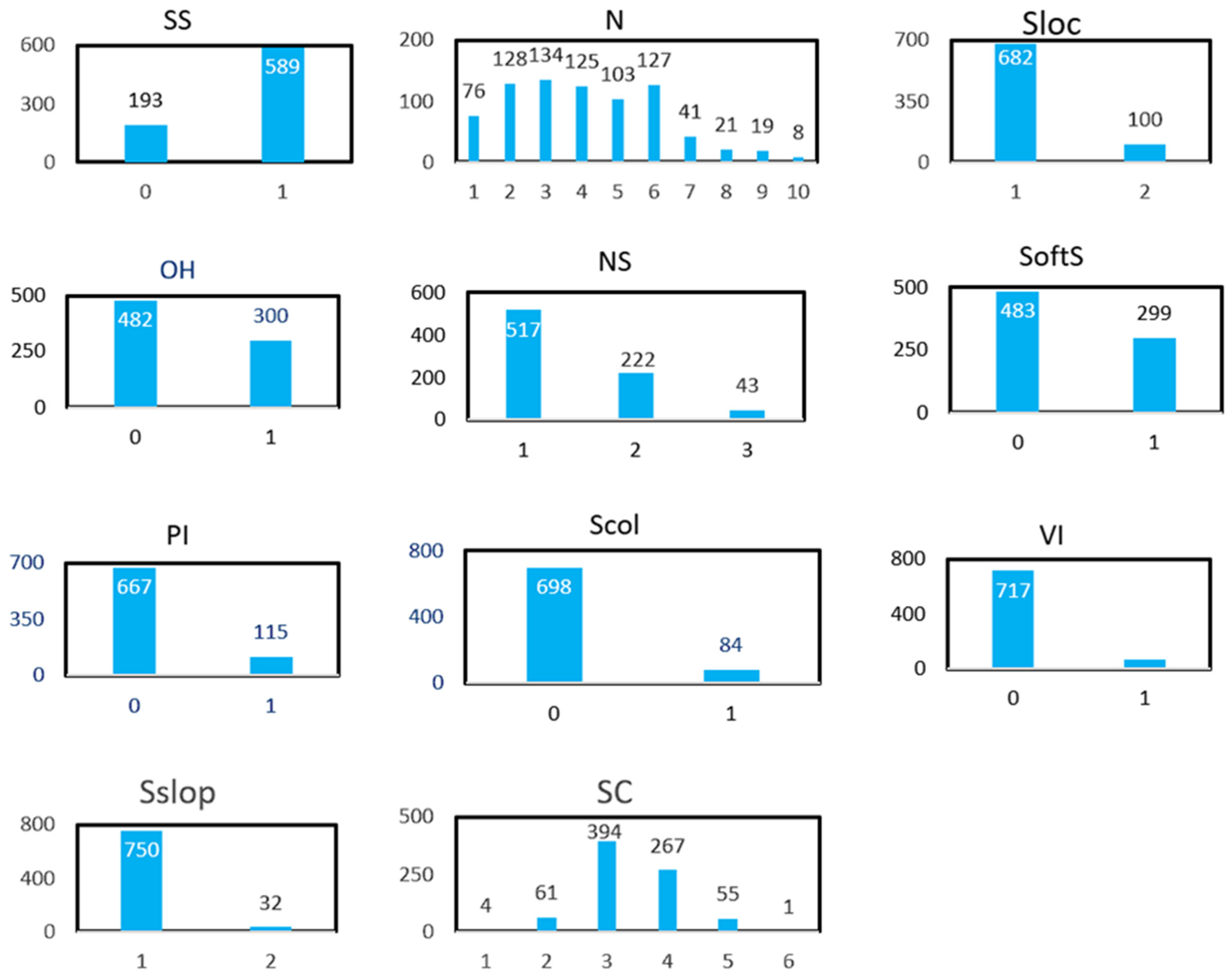 Overhang (OH) feature was present in almost half the buildings with overhang, a feature that could potentially be a cause for concern in the event of seismic activity. There existed a soft story (SoftS) in a significant portion of buildings, indicative of a potential vulnerability. Analysis of structural system (SS) revealed that most of the buildings shared a specific design, and there was limited variation in the dataset. All the other categorical features such as plan irregularities (PI), short columns (Scol), position of slabs (Sloc), slope of soil (Sslop), and vertical irregularities (VI) exhibited similar trends, with most of the buildings not possessing these potentially risky features (