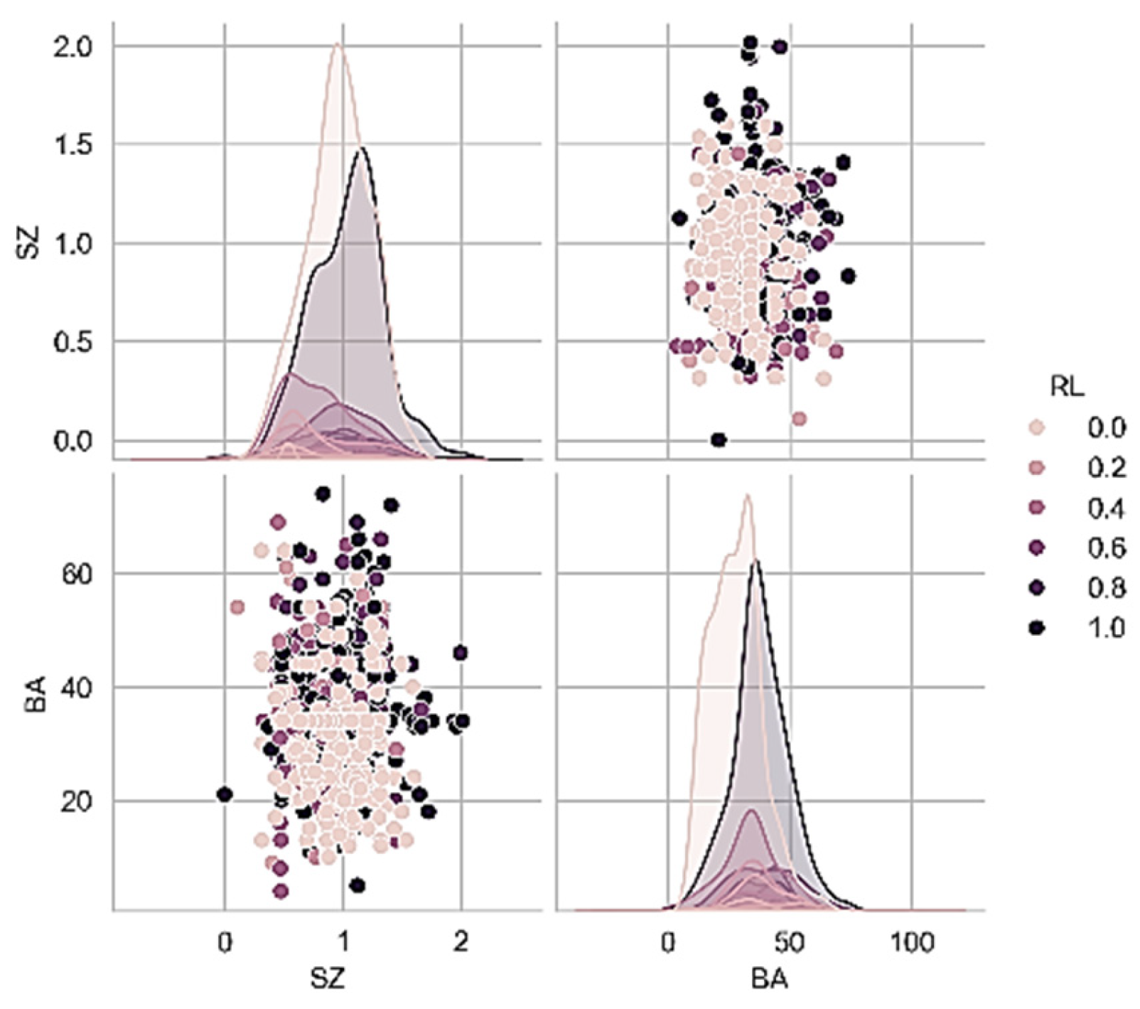 Numerical variables, such as seismic zone (SZ), age of buildings (BA), and level of risk (RL), were analyzed via pair plots, shown in