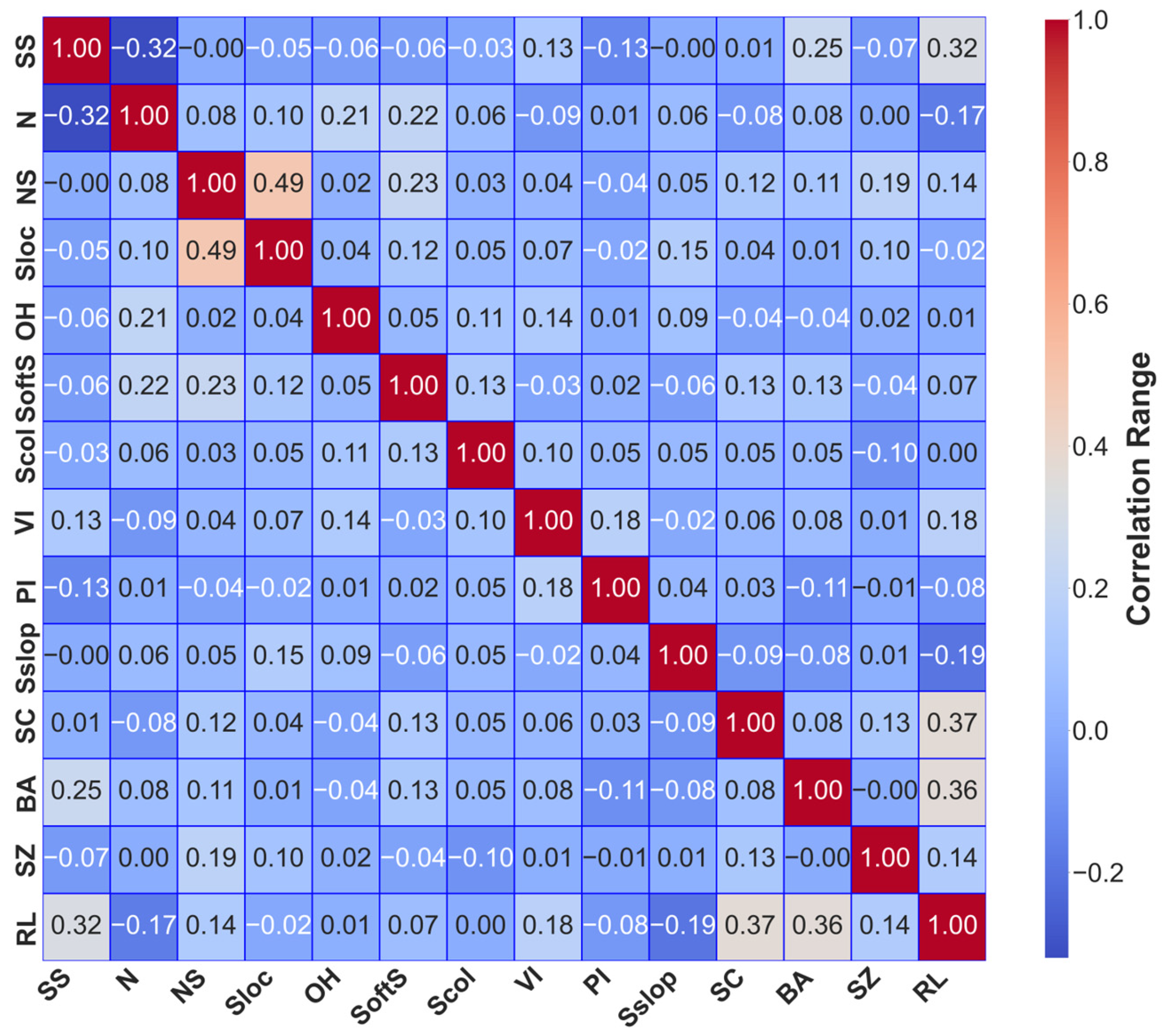 The Pearson correlation coefficient was employed to quantify linear relationships among numerically encoded features, as it is most suitable for continuous and ordinal categorical variables. Correlations above |r| = 0.8 were examined for redundancy; none exceeded this threshold. A weak negative correlation between the number of floors (N) and the structural system type (SS) indicates that taller buildings may have implemented particular design modifications to efficiently handle structural load distribution. Low correlations between categorical variables, including overhang (OH), vertical irregularity (VI), and soil slope (Sslop), are suggestive of a complex way in which these variables contribute to risk assessment that might not be entirely reflected by linear correlation analysis alone.