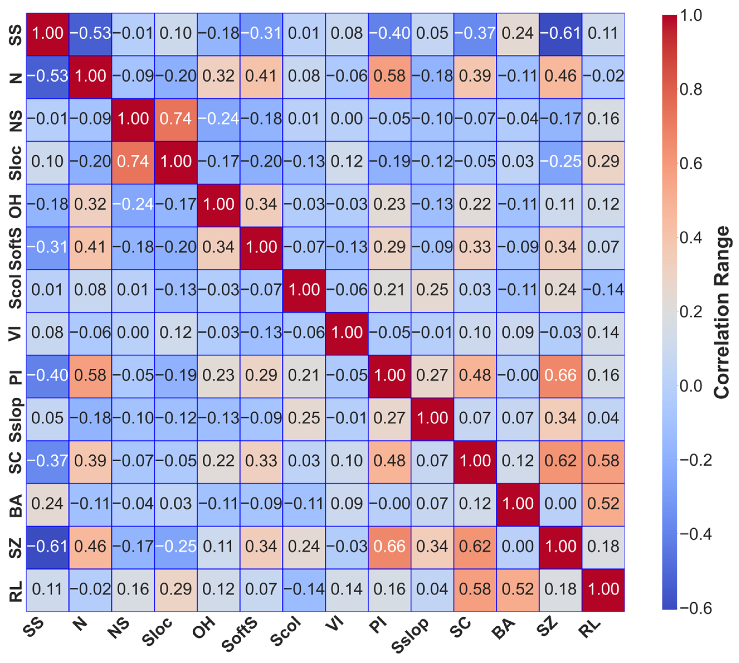 The results of the correlation analysis show that most structural parameters have poor individual connections. This highlights the necessity for sophisticated modeling methods that can effectively capture non-linear interactions to enhance predictive accuracy. The weak correlations among independent variables indicate minimal multicollinearity, which is advantageous for machine learning models by reducing redundancy and improving interpretability.