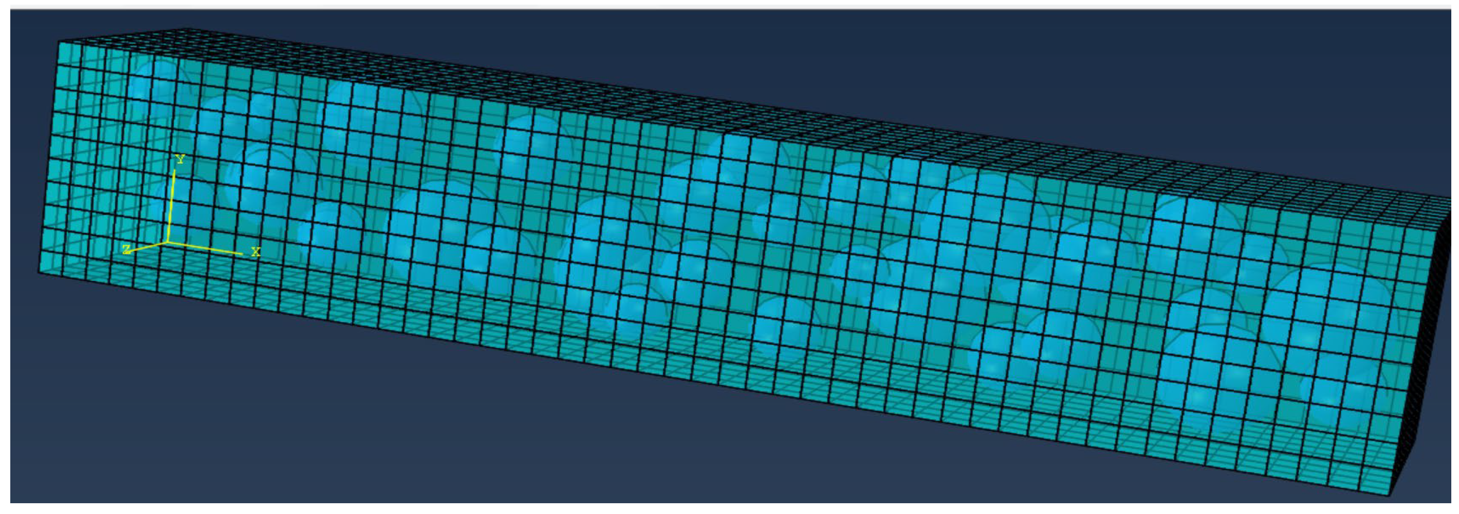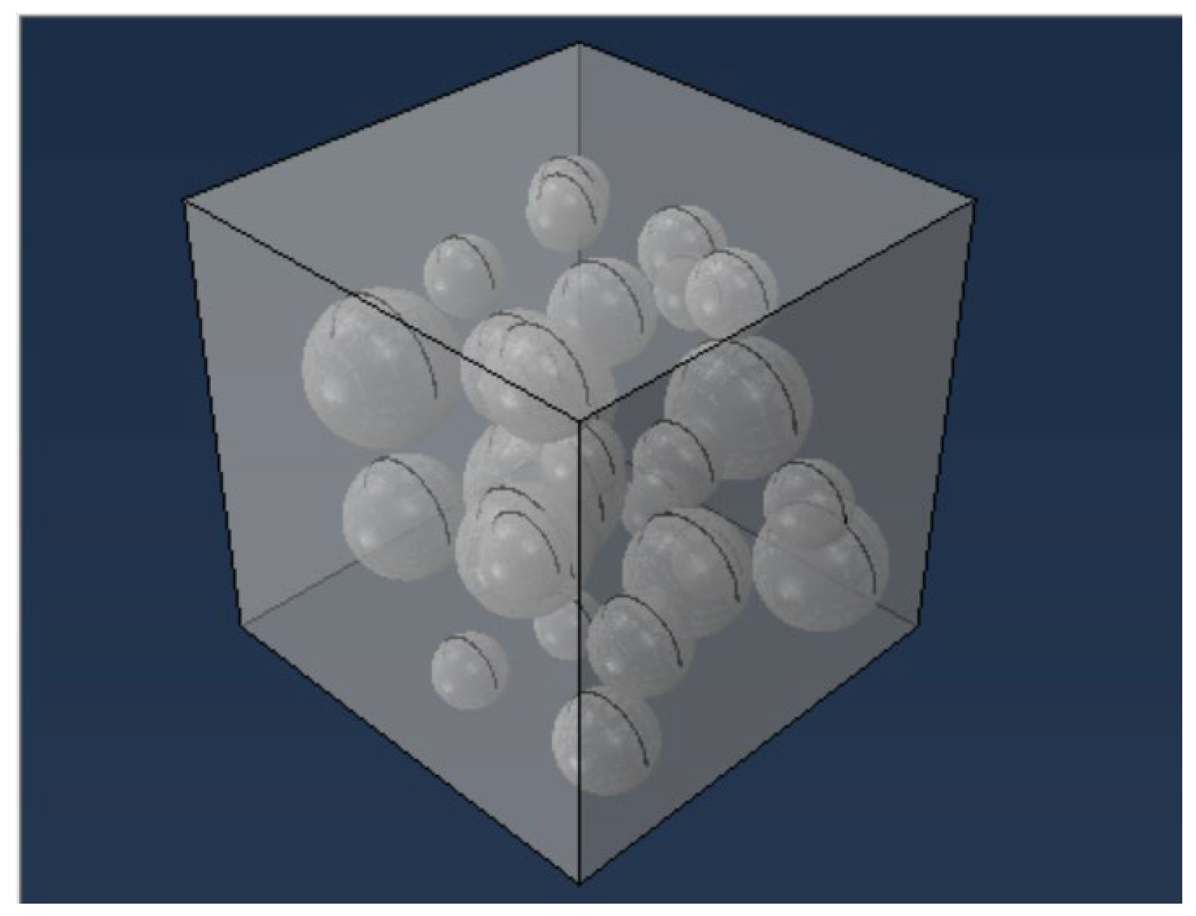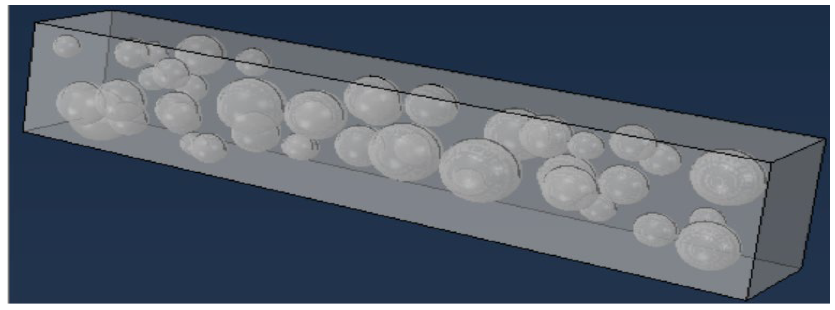 - A prismatic beam with specified dimensions was created to serve as the domain into which spherical aggregates and concentric spherical shells were generated.