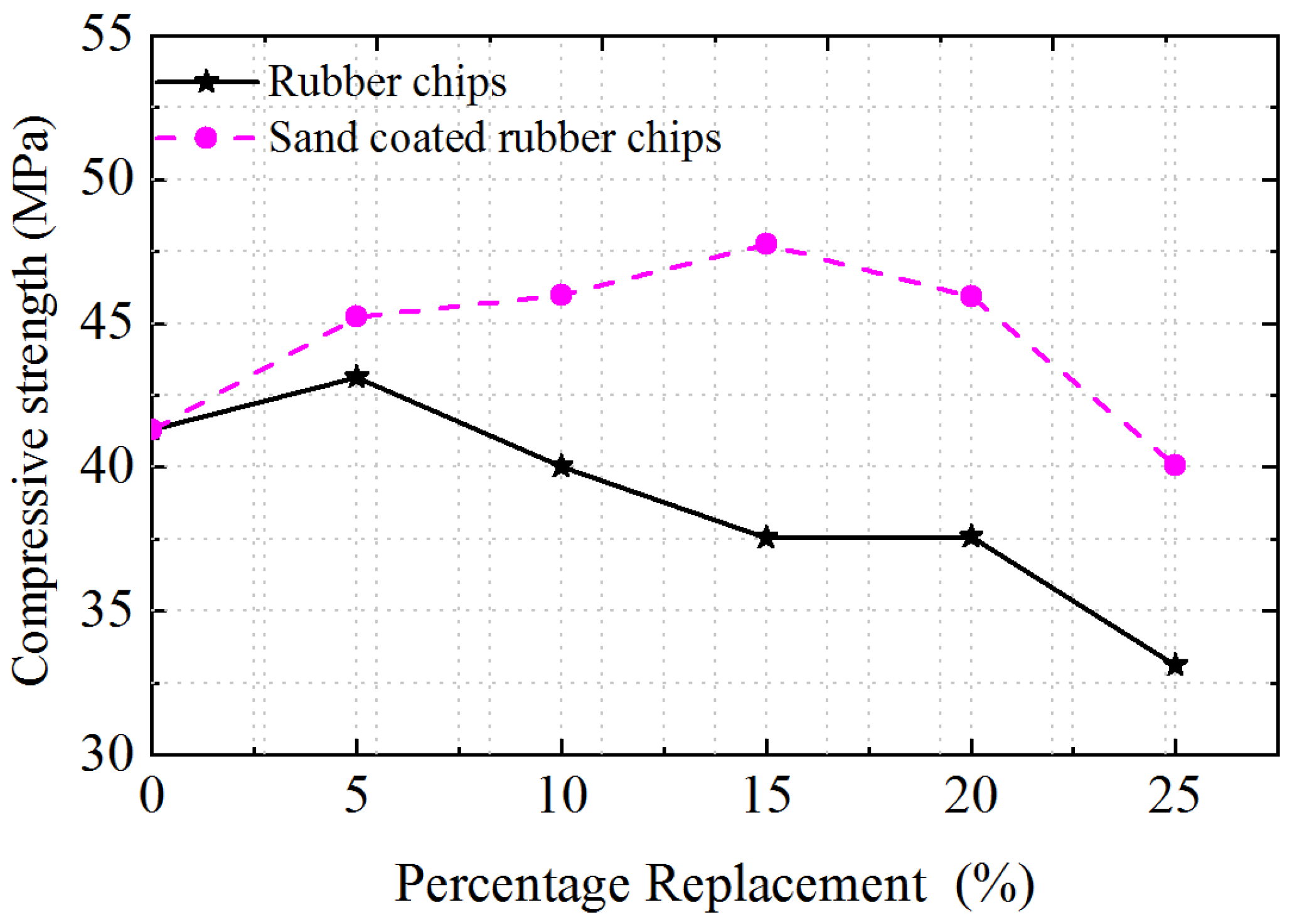 - Up to 20% replacement of coarse aggregates with sand-coated rubber chips, results in improvement in compressive strength. This shows coating the surface of rubber particles with sand results in a rough texture, which enhances the bond at the interface between the rubber and the concrete matrix. This improved interfacial bonding contributes to an increase in the compressive strength of concrete.